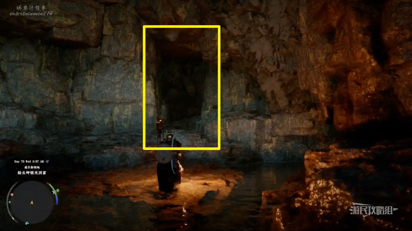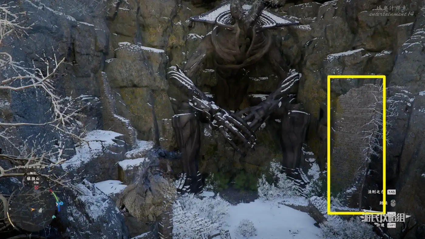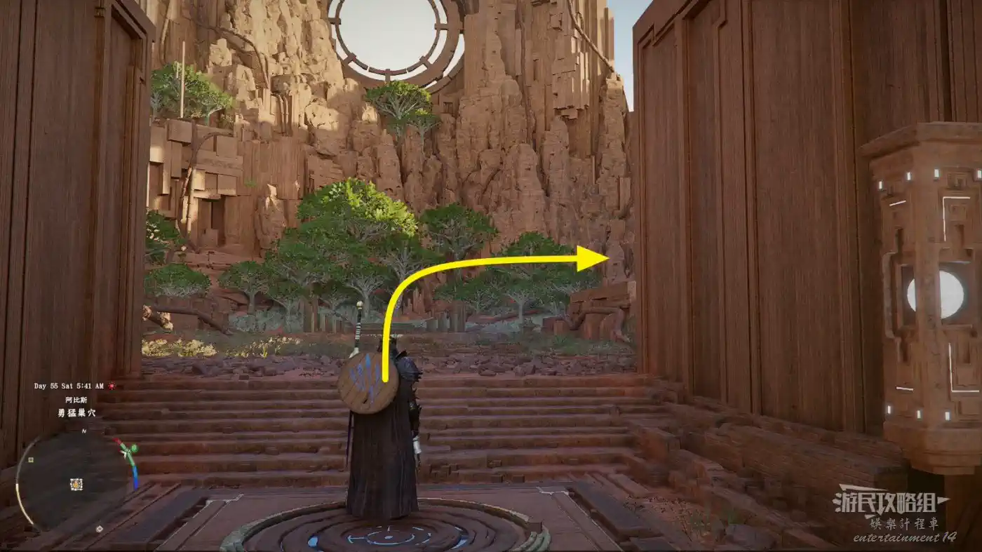 然後保持這個面向,稍微往左轉視角到偏左的柱子處,往柱子後方的岩壁上看,可以看到一個洞口。可以參考下圖中左下角小地圖上,傳送點標記的位置。