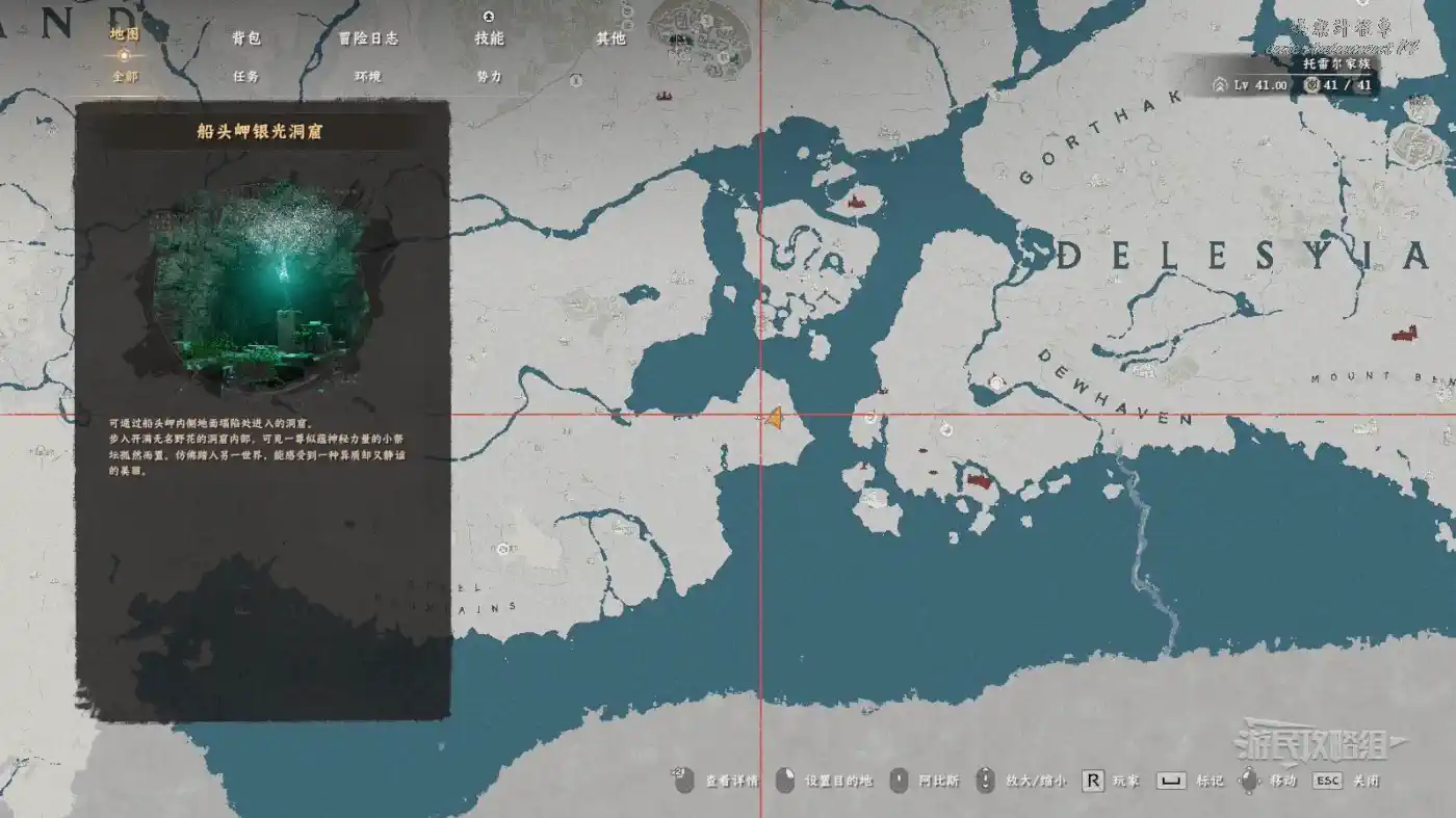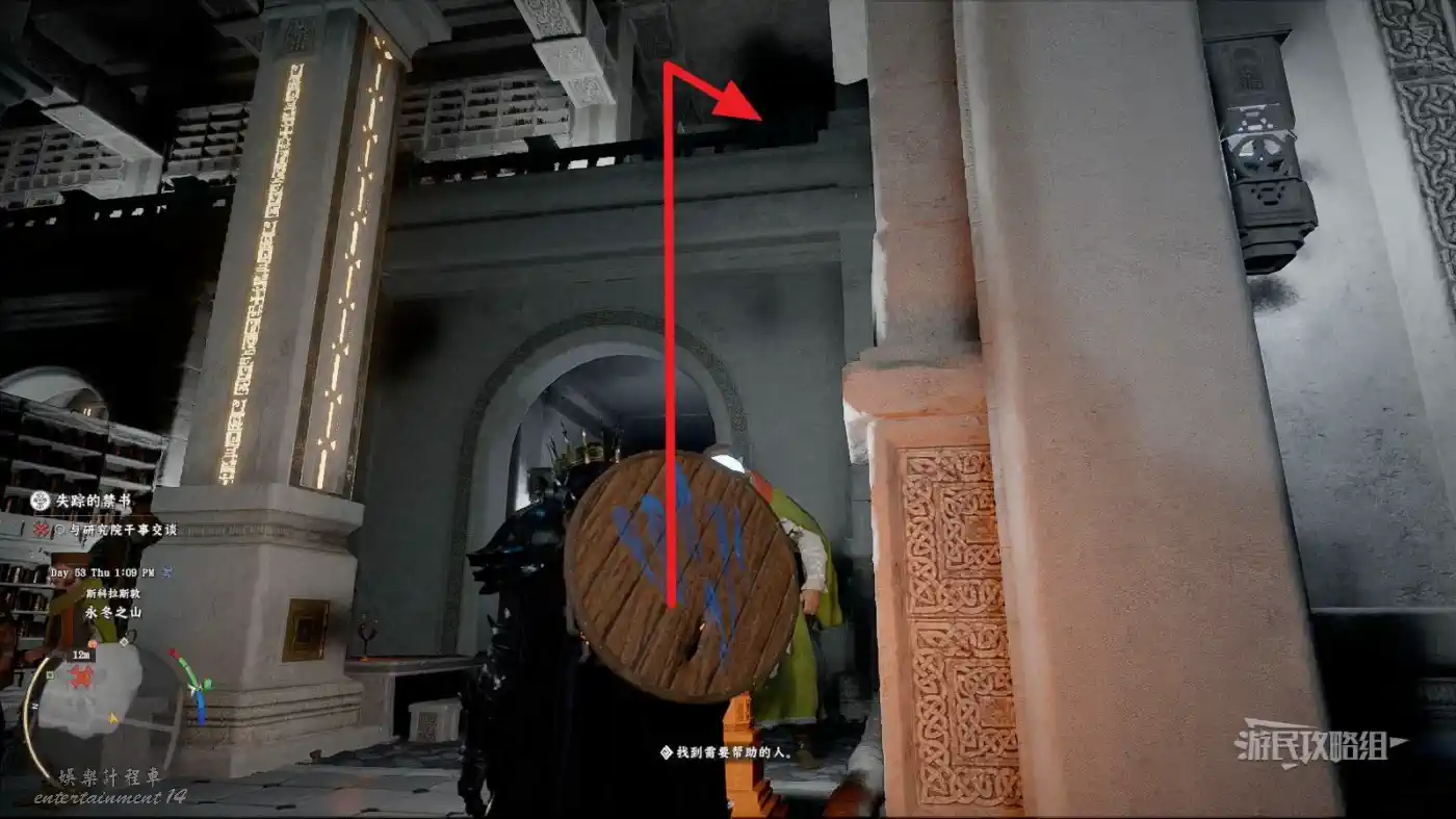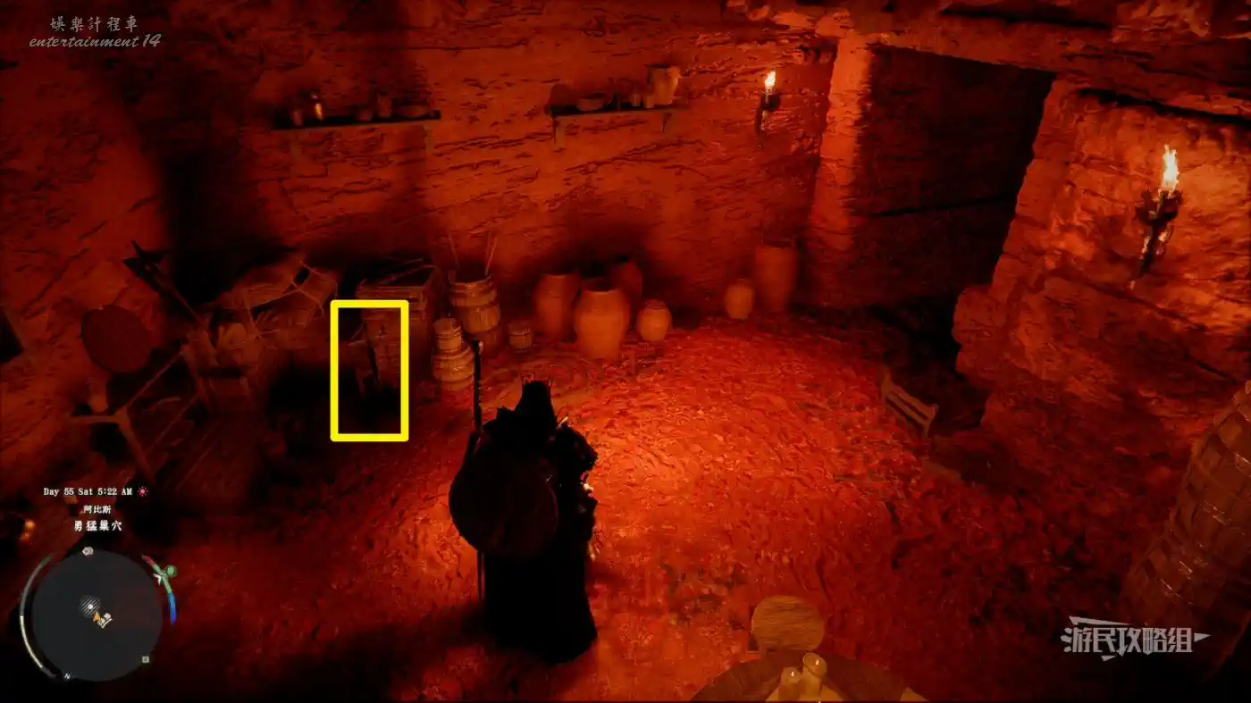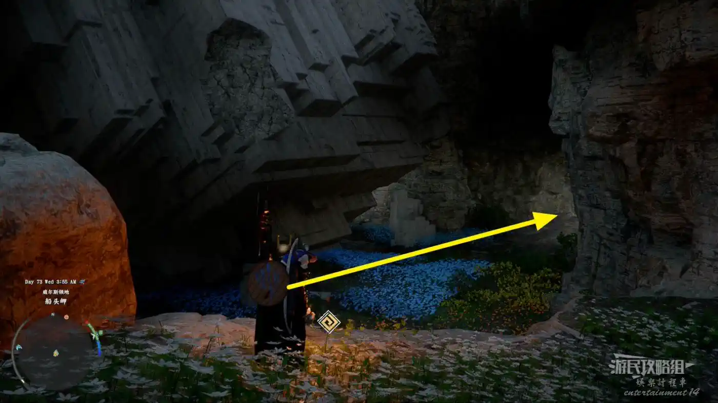 然後保持這個面向,稍微往左轉視角到偏左的柱子處,往柱子後方的岩壁上看,可以看到一個洞口。可以參考下圖中左下角小地圖上,傳送點標記的位置。