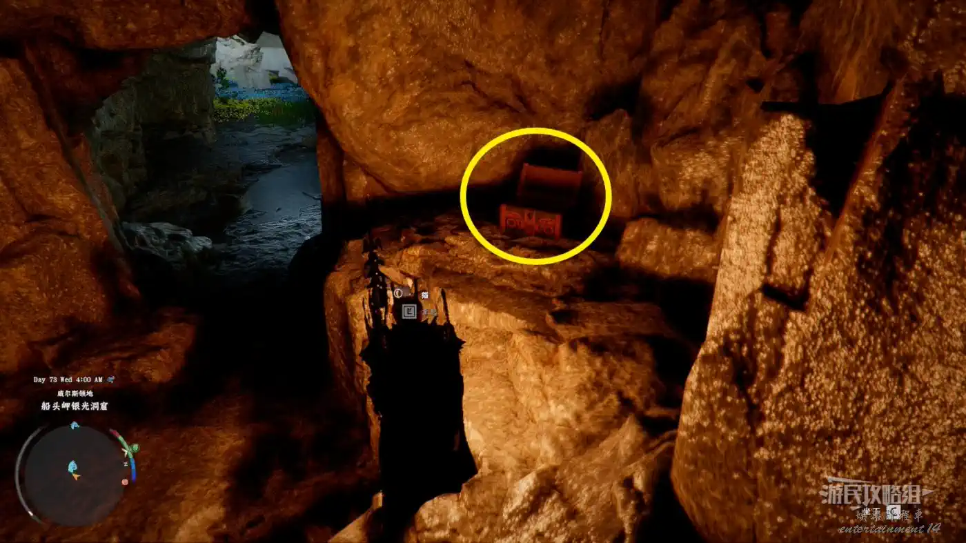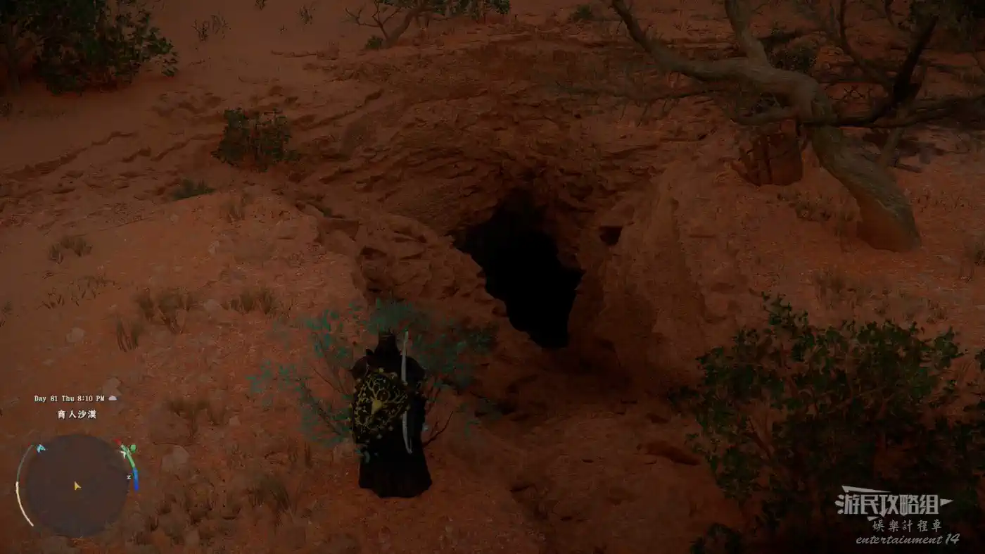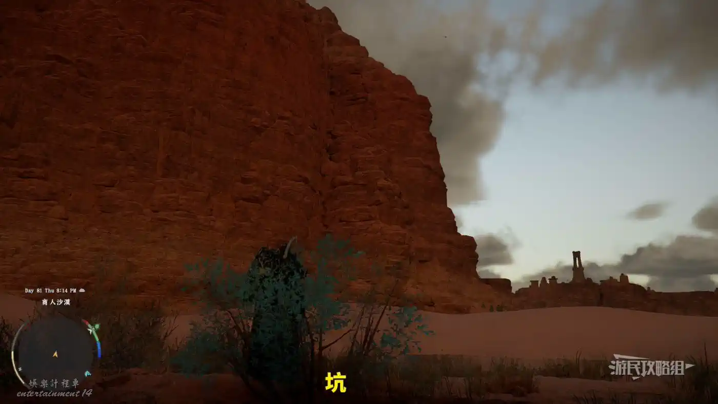 在岩石峭壁堆中,爬上高處,參考下圖中黃圈,在平地上突出的小土堆,這靠近會出現沙蟲敵人,參考沙蟲位置,爬到距離沙蟲所在平台最近的旁邊的平台上(注意這個平台比沙蟲所在平台略高一些)。