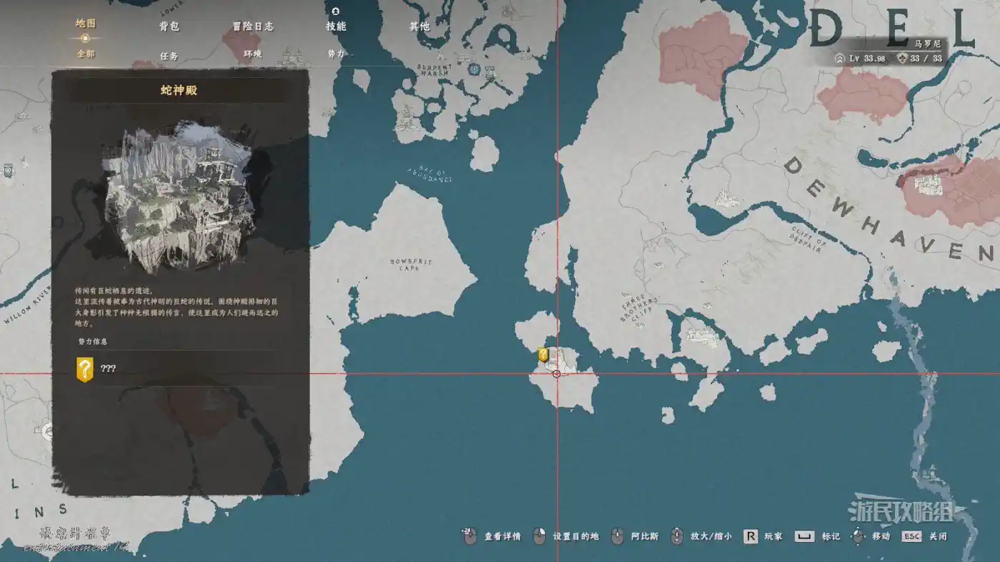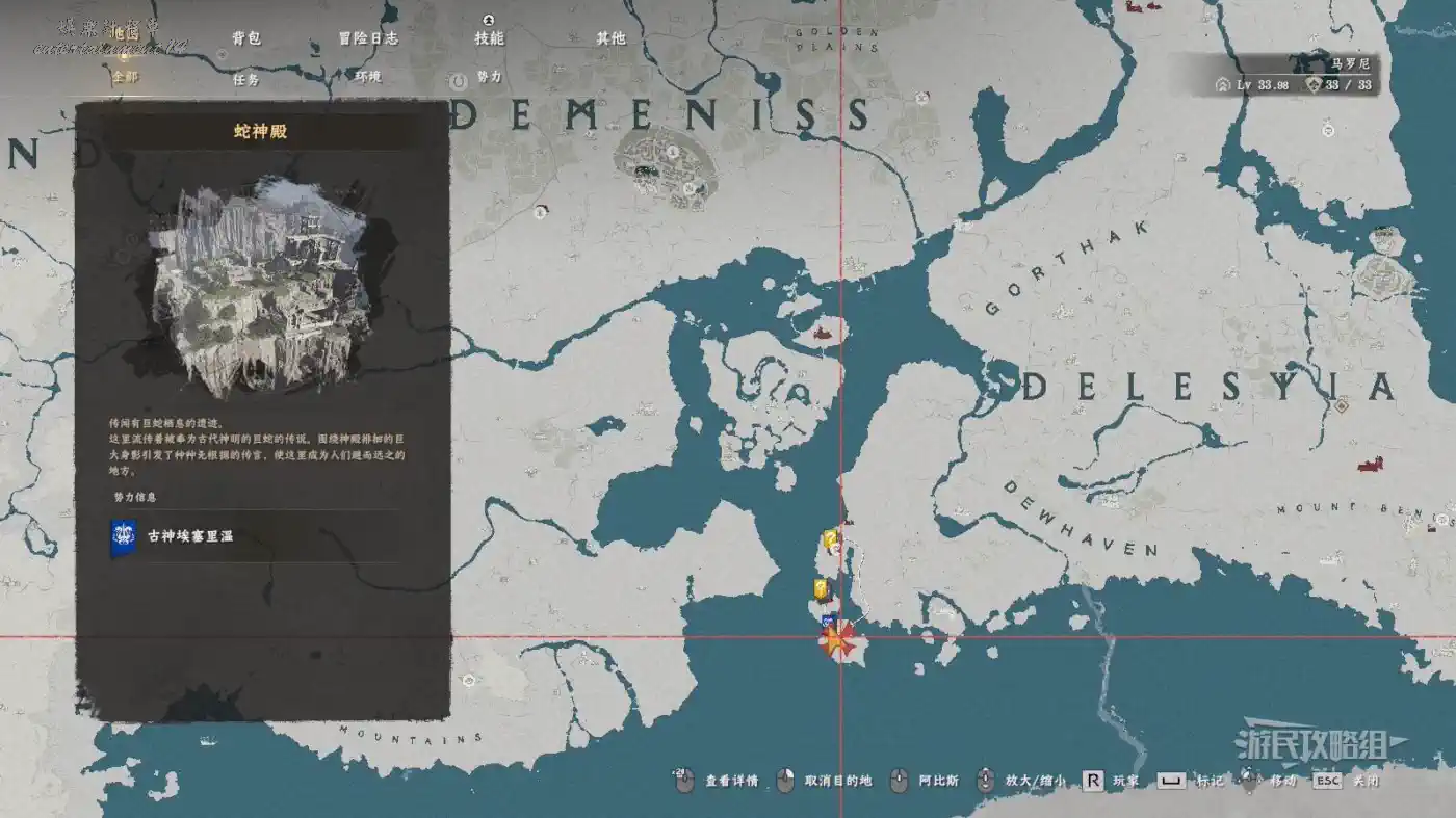 蛇神殿位於地圖上德雷西亞區域的西北邊,可以從戈爾塔克方向或天空島俯衝前往,不建議走直線游泳過去。