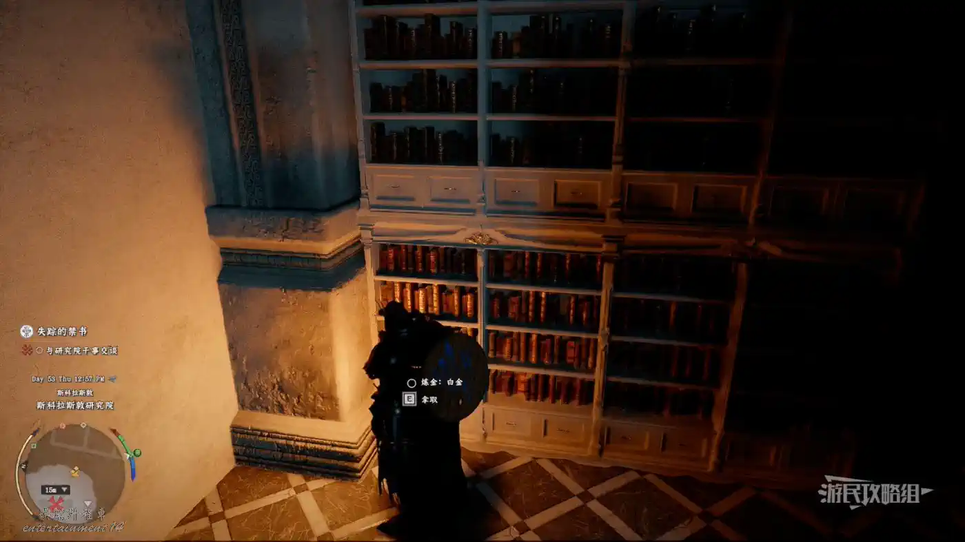 【白金】在斯柯拉斯敦研究院內書庫二樓的書架上,就是書庫入口右手邊二樓最邊上的書架(需要從書庫一層盡頭的樓梯上二樓)。