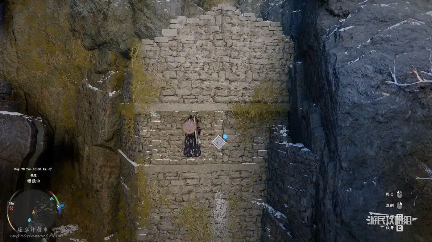走到石柱處,繼續往前看可以看到峭壁,峭壁旁邊有一棵樹,走到樹的位置往下跳,這裡應該會跳到下層的遺跡底部。