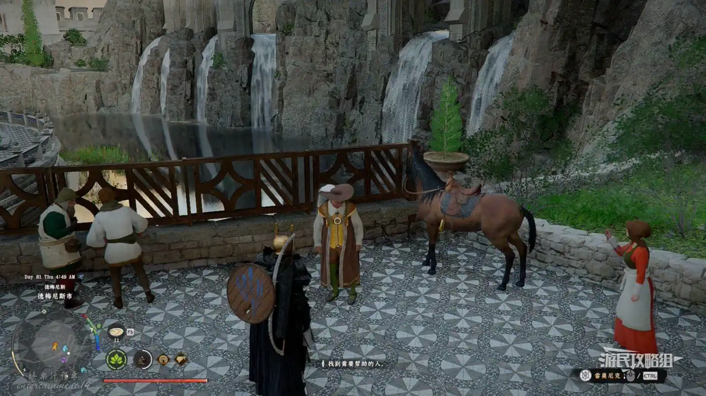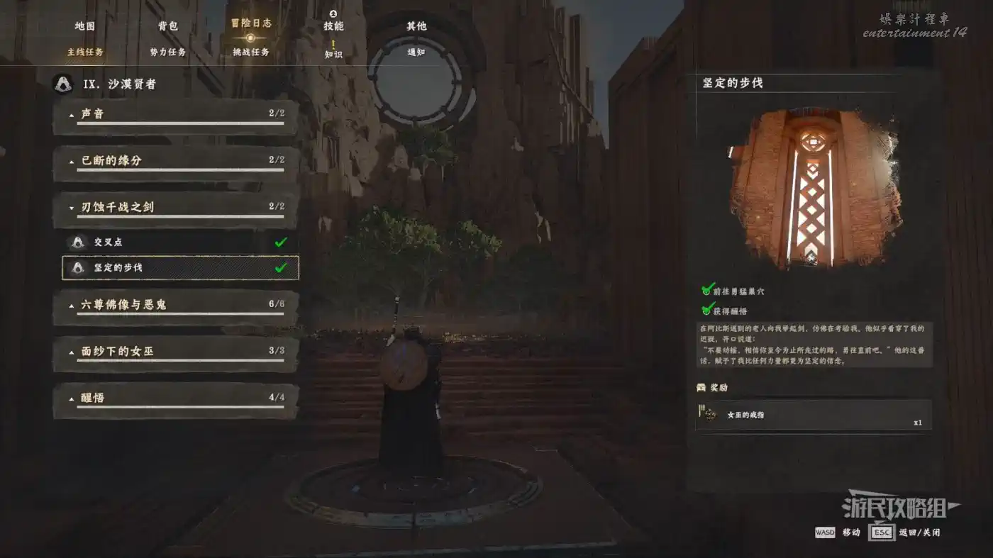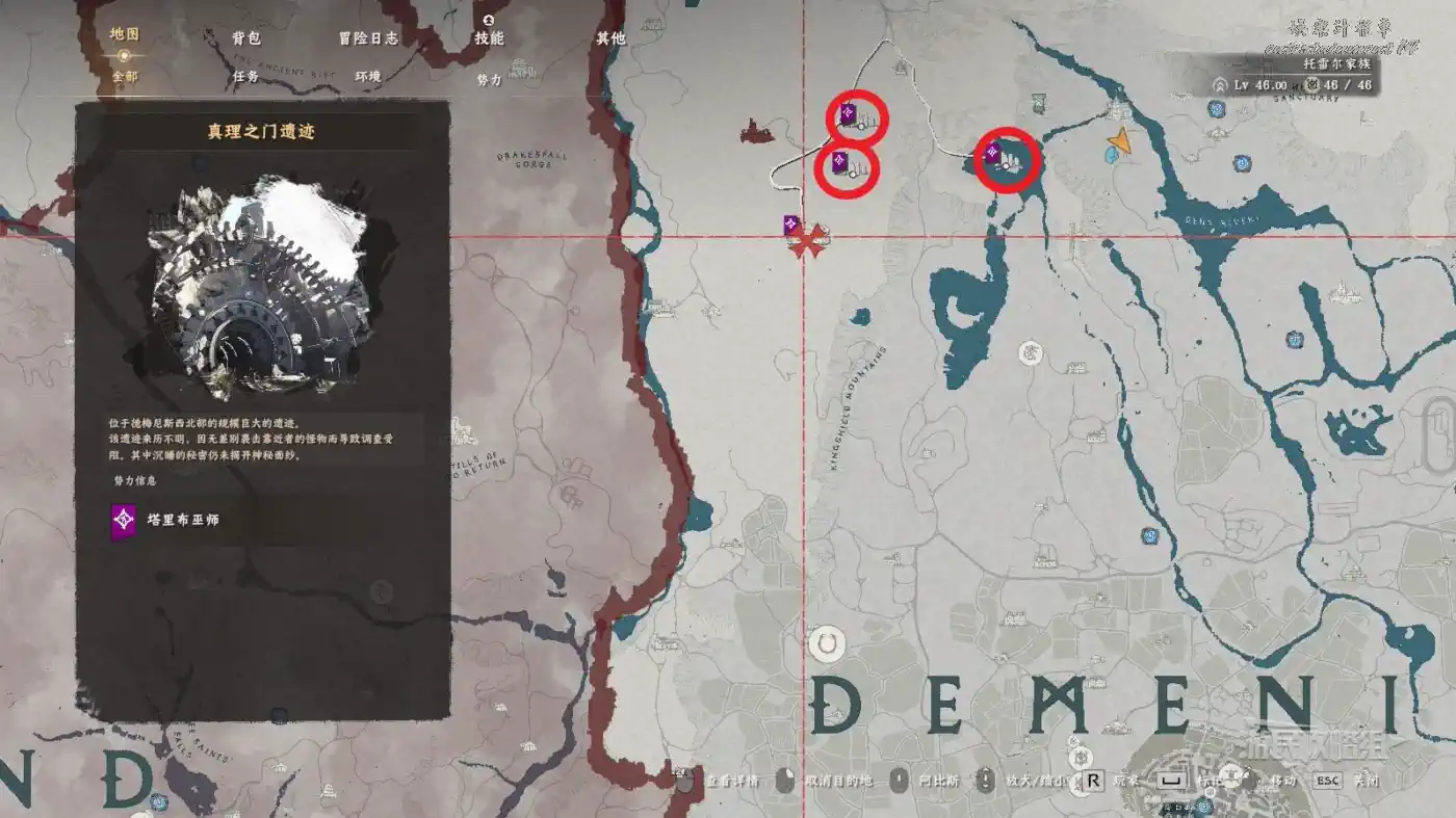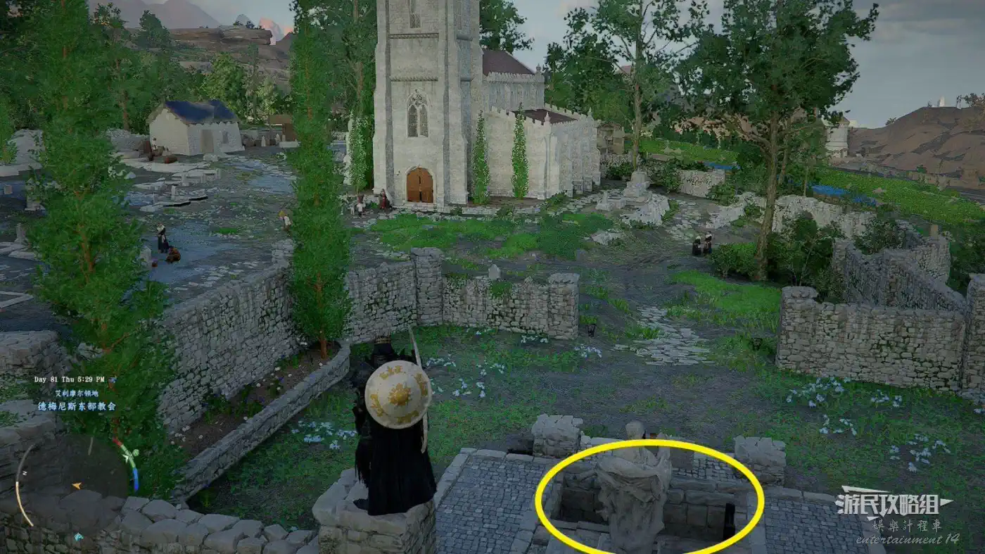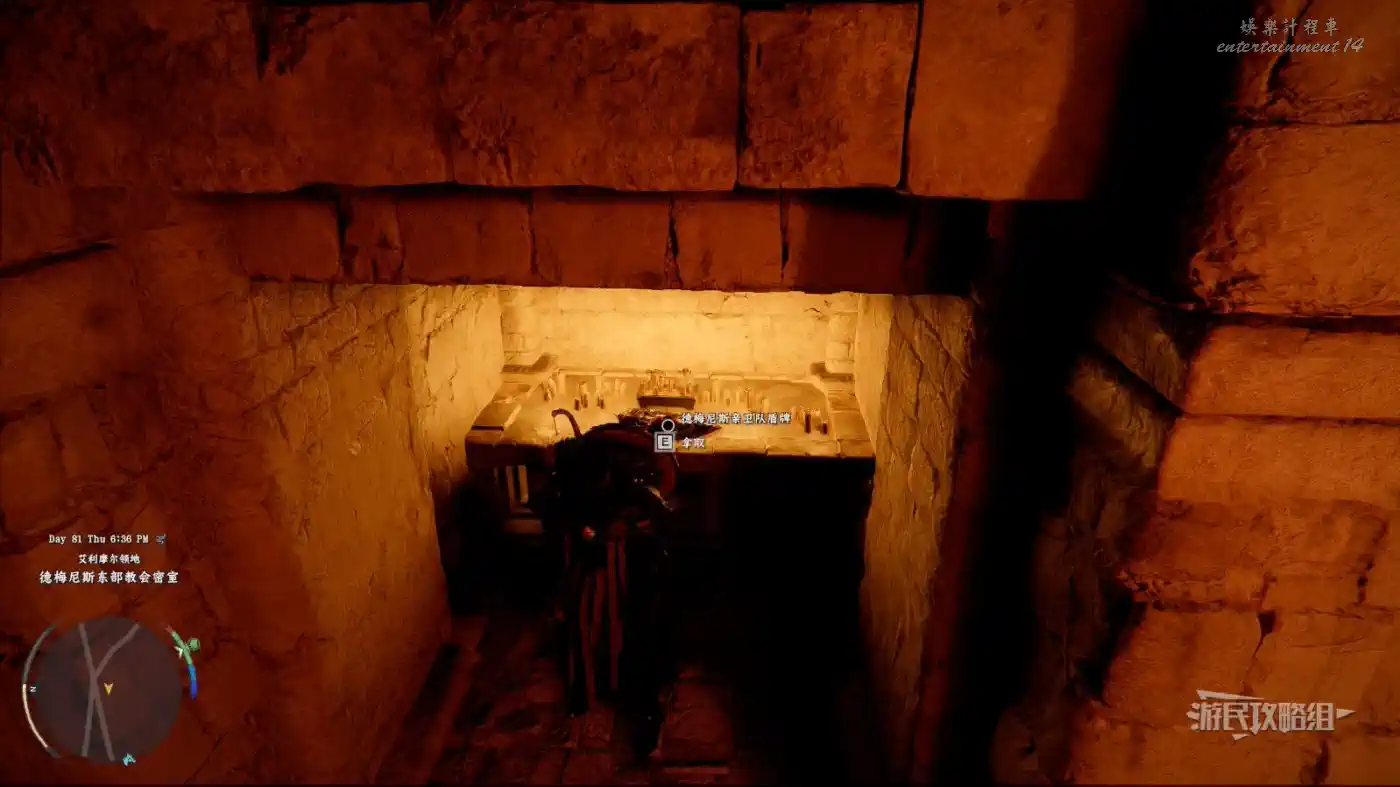 位於地圖上德梅尼斯的最後一個字母S右側的【德梅尼斯東部教會】,在教會建築正對面的墓地雕像前地上有個坑,跳進坑裡來到密室,注意密室中有許多機關和絆雷,小心避讓,如果沒帶弓箭或其他投射物的話,絆雷也可以考慮用風之帷帳解決。