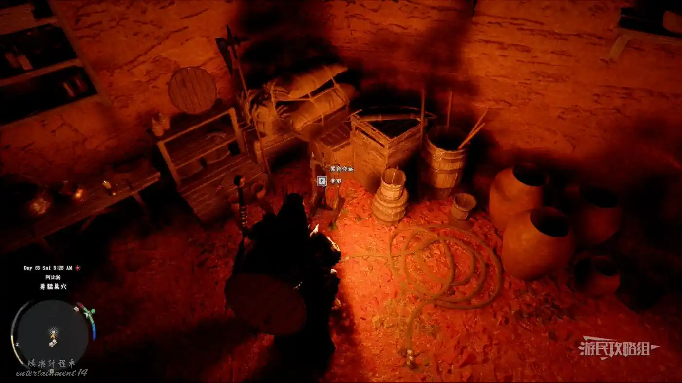 傳送到【勇猛巢穴】後,從傳送點直走到中間一堆金屬柱所在位置,然後右轉,可以看到一個洞口,進入洞口即可在房間角落的架子上拾取單手劍黑色命運,旁邊還有一些其他武器和素材。