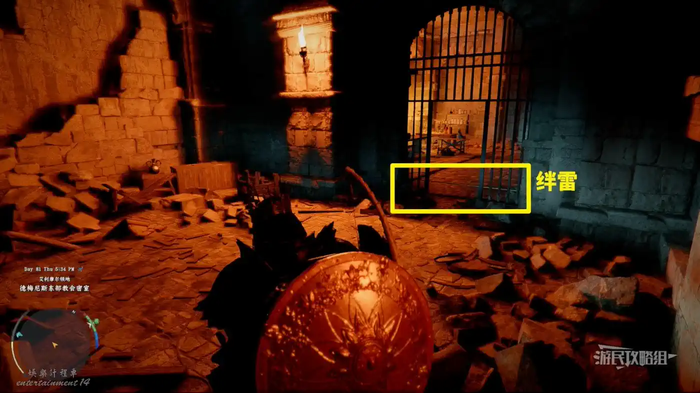 進入密室後,沿著唯一的路往前走,看到第一個鐵柵欄門,注意門前有絆雷。
