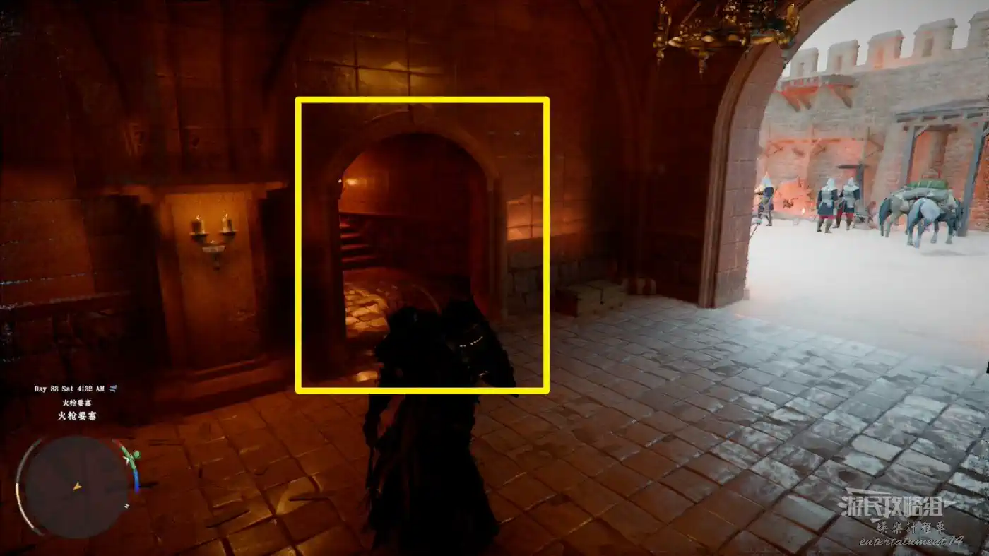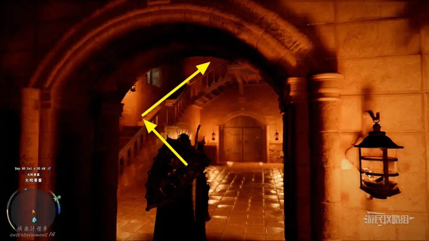 穿過鐵柵欄門,正前方的牆上可以看到一個拉杆,操作拉杆。前方會有好基礎尖刺和射箭機關,注意避讓,沿著唯一的路前進。