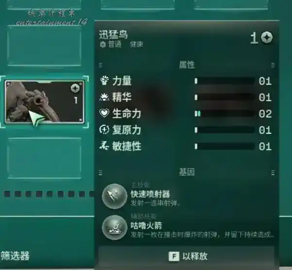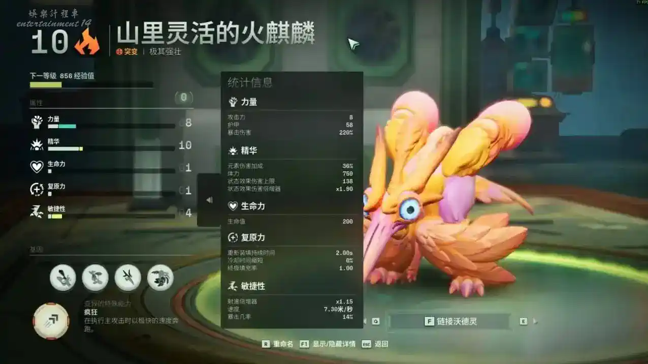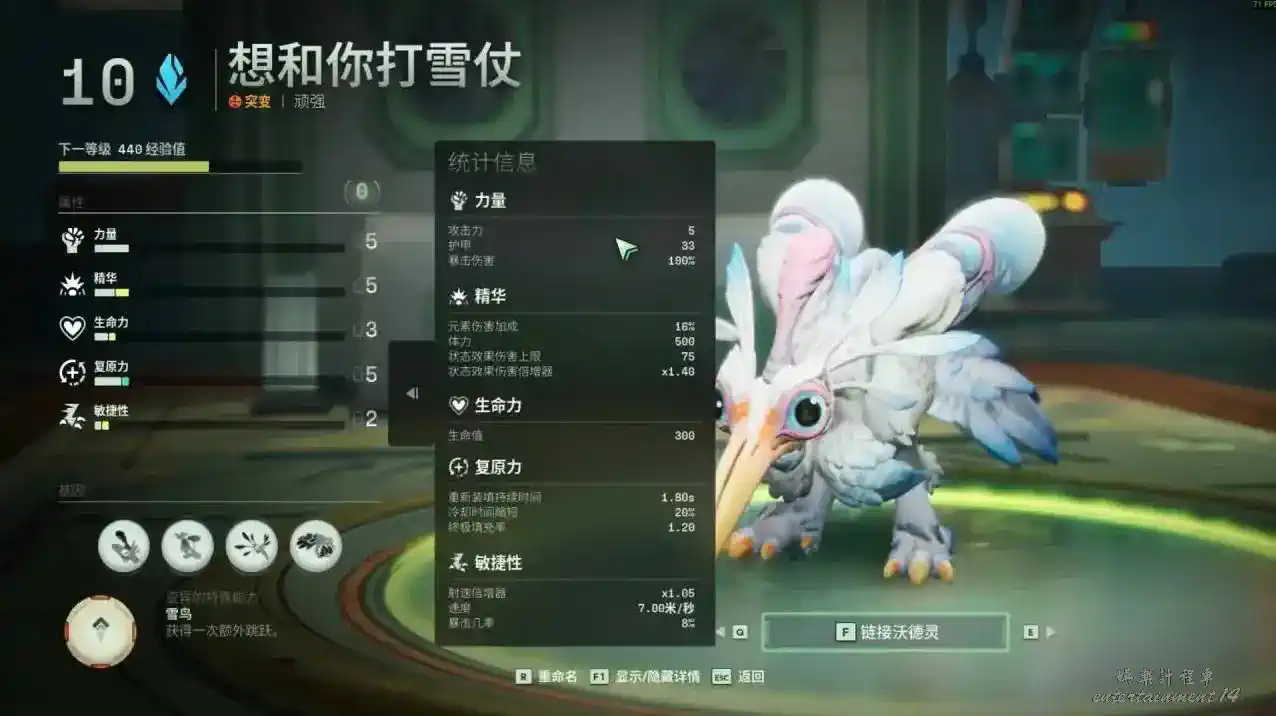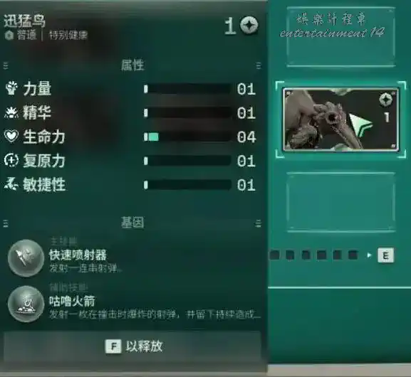 不同種族寵物基因組技能不一樣,本次主要說迅猛鳥的,迅猛鳥有個衝刺後短時間內獲得無限體力的技能非常強,因為目前衝刺冷卻和這個無限體力buff完全可以實現全程覆蓋,這使得迅猛鳥基本上不需要手動恢復就能全程輸出不停止,這個技能就非常適配使用高速輸出的寵物。