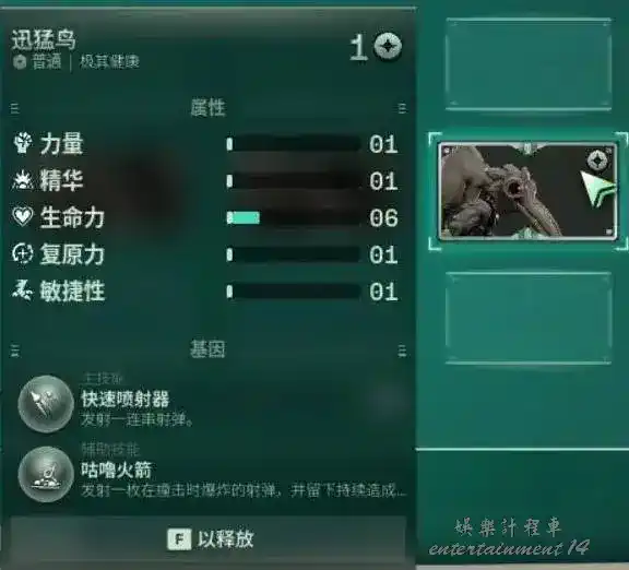 有一隻技能是瘋狂的鳥就非常適合這個技能,這個瘋狂可以讓它邊跑邊輸出,無限耐力彌補了它射速過快耐力消耗過快的缺點,所以在無限耐力加持下,就可以全場一直在射並且不是在衝刺就是在加速跑,怪的攻擊基本上隨便躲,玩起來非常快樂,類比我玩的其他遊戲中的玩法就是xx的勇氣重弩,加速跑和勇重的跑有點像哈哈。