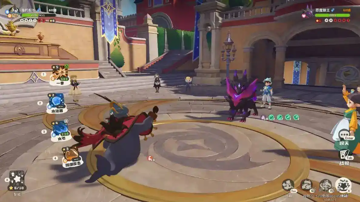 (注)一定要到最後直到【防禦反擊】能夠抗下惡魔狼王的【星星撞擊】而且惡魔狼王的能量不足以再使用【星星撞擊】的時候換上「海豹船長」這個時候不管對面是什麼精靈,我們「海豹船長」直接使用【一拳】!一擊必殺!(因為前面水藍藍和水泡殼應對下來已經為「海豹船長」疊加了很多【身經百練】特性增益,此時的【一拳】可謂是真的一拳!