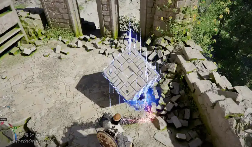 再去北側缺口下跳,撿動力立方體(電池),帶回中央裝置左側插槽,勁法壓入