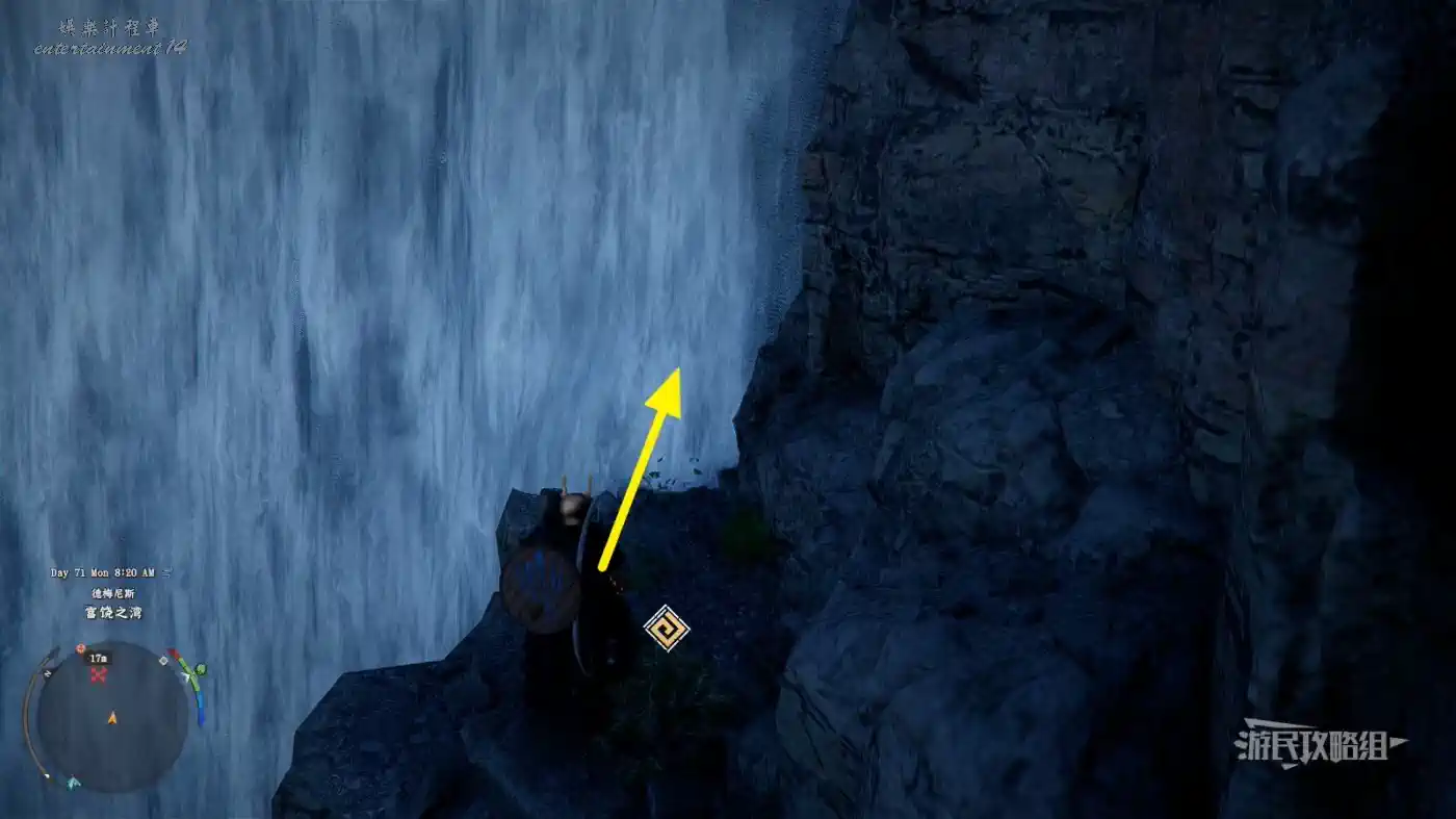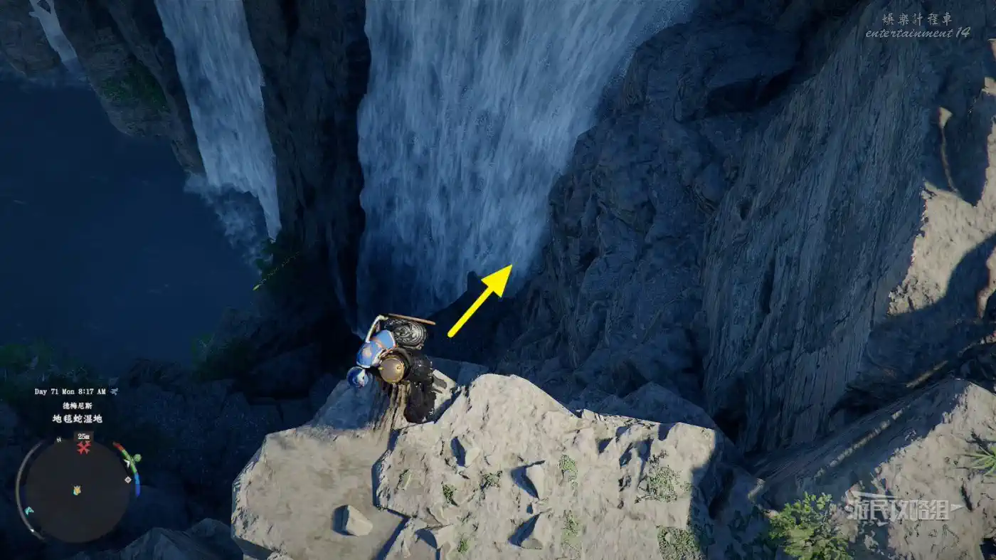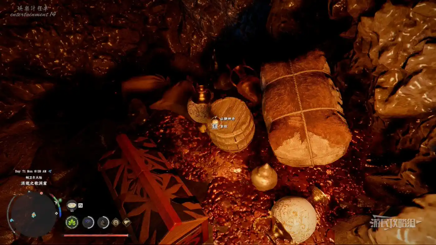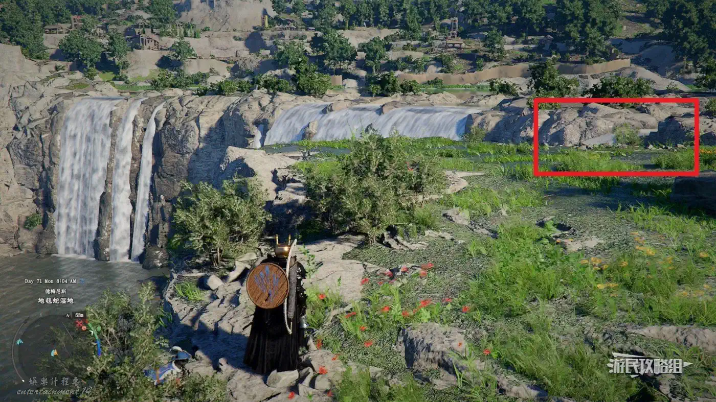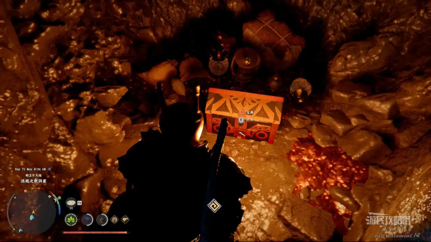 赤血沙漠 (Crimson Desert) 德梅尼斯英雄火槍位置及獲取方法 7 4 月 2026-04-07 廣告 作者:瑞破受氣包 來源:遊民星空 遠端武器德梅尼斯英雄火槍獲取方法 可裝備角色:德米安 位於德梅尼斯地毯蛇濕地巨大瀑布後的消逝之歌洞窟中。參考下方地圖前往巨大瀑布所在位置,面對瀑布,前往右側第一條瀑布所在位置,往下看可以看到一個石頭平台,跳到平台上,按刺擊(R1+△/RB+Y/Shift+滑鼠右鍵)穿過瀑布即可進入洞窟,沿著唯一的路走到洞窟盡頭,開啟寶箱即可獲得。另外,寶箱後面還有一顆【止靜神丹(滿血復活藥)】。