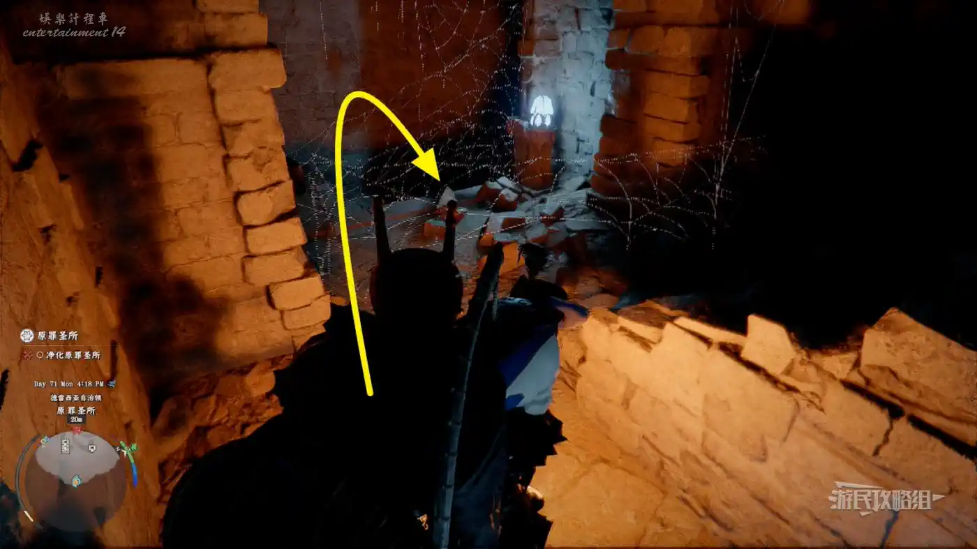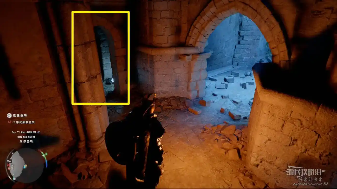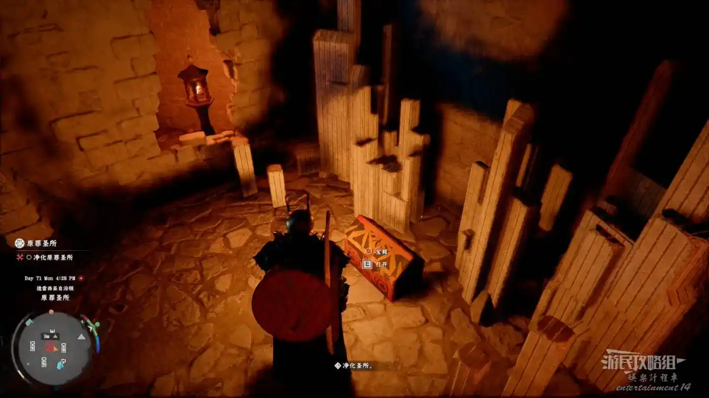 下樓之後可以看到淨化聖所需要找的方塊,方塊旁邊有個石燈籠,是燈籠是開房間正面尖刺機關的,點亮石燈籠,從旁邊的缺口進入房間,開啟寶箱即可獲得。