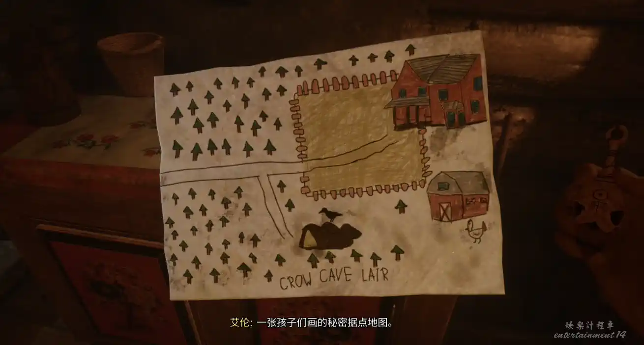出門後會看到神秘女子指引方向,一路跟隨,來到被柵欄為主的農場,根據之前得到的畫,知道右邊有個洞穴,獲得道具手電筒和房子的鑰匙,以及收集品的第一枚徽章。