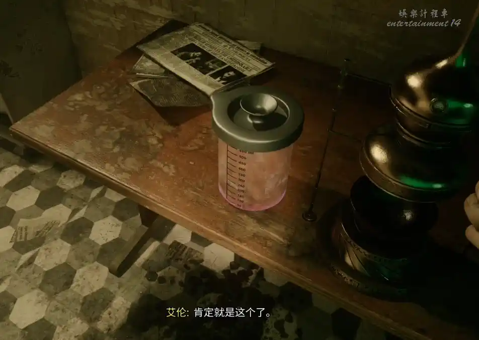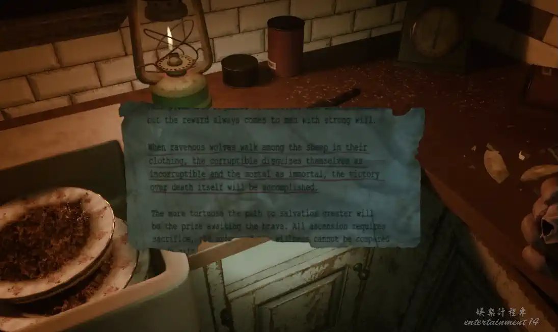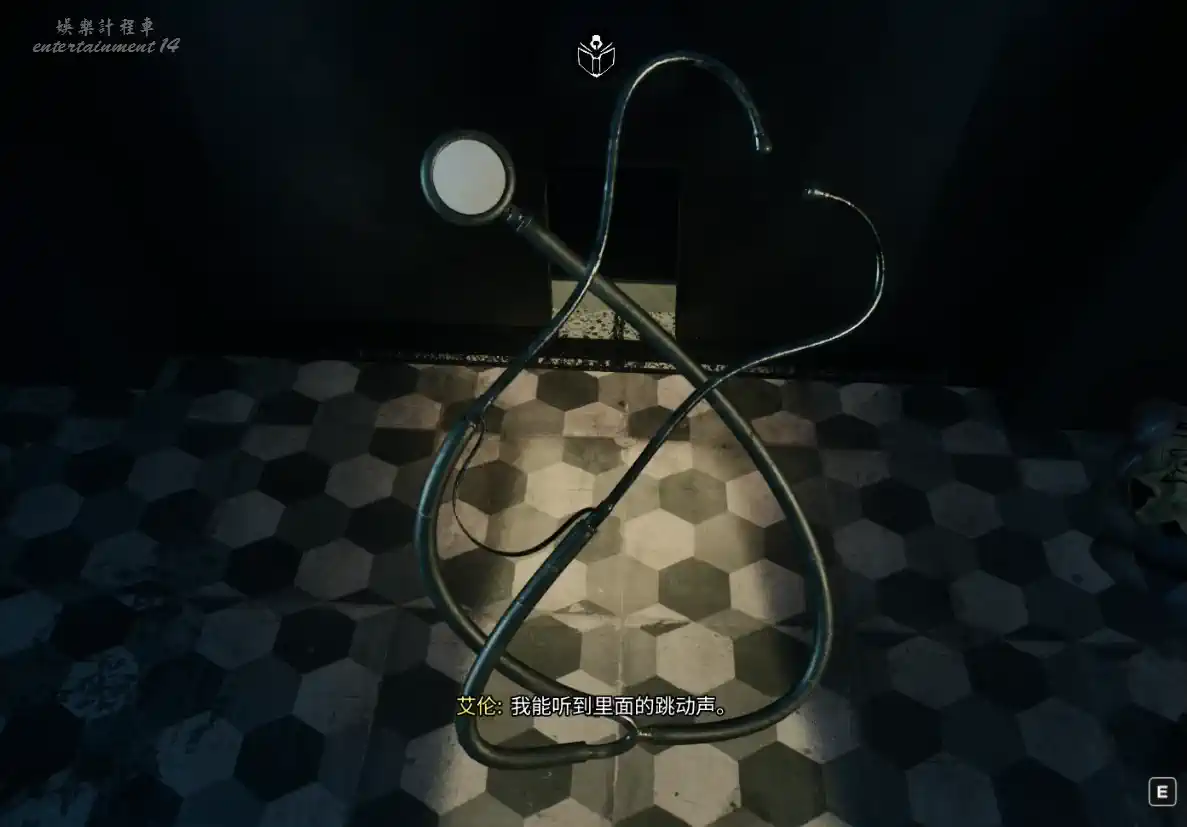 從左邊開始探索,會看到照片和鋼琴,繼續往前走,靈擺會閃爍,使用後會發現廚房有亮點,檢查後獲得第一張福音殘頁。