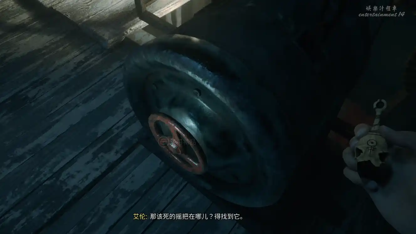 調查倉庫,發現梯子,爬上去,發現吊機,但缺少搖柄。