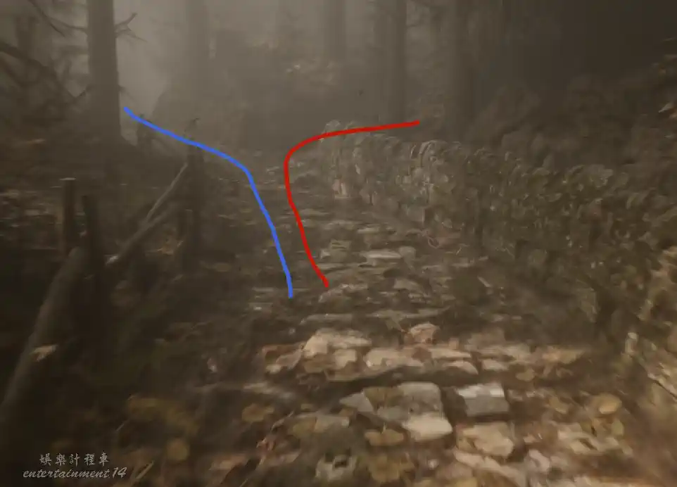 一路向前來到一處岔路,其中藍色標明的路線,一路向前會看到斷橋,然後只能返回走另外一條紅色線路岔路。