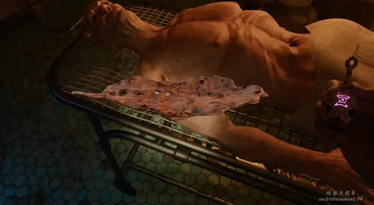 離開房間回到治療室(有兩具屍體的房間),觀察化妝了的屍體,得到提示藍色眼影,鼻子和嘴唇都是紅色。對照著畫一具屍體,得到福馬林。(這裡化妝,每一步都要一筆劃完,不然可能會出現判定合格的情況。)