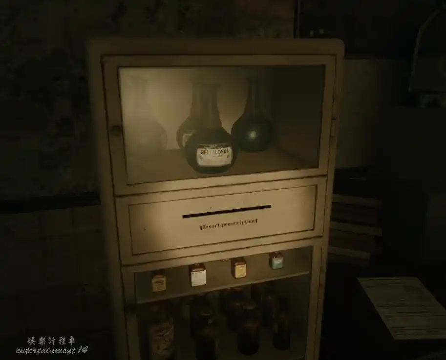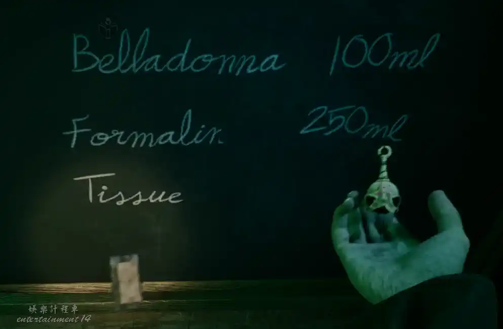 離開該房間後,繼續往前探索右側走廊盡頭房間,發現製作配方的容器、一張桑德斯醫生的處方單(簽字模糊)和擦除的黑板。