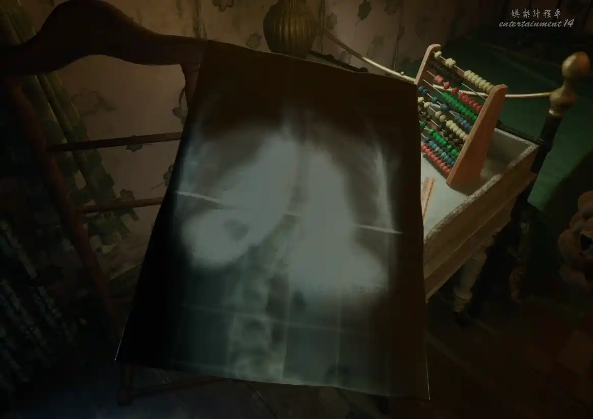 探索左側房間,推開櫃門,發現隔板,用錘子撬開隔板後,繼續探索新房間發現肺部X光片。