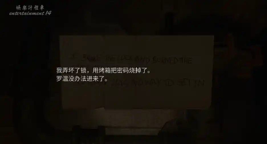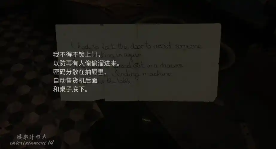 在廚房後桌上得到密碼提示,調查後獲得數字13,72,8。再根據提示順序,得到13728的組合,打開門鎖。