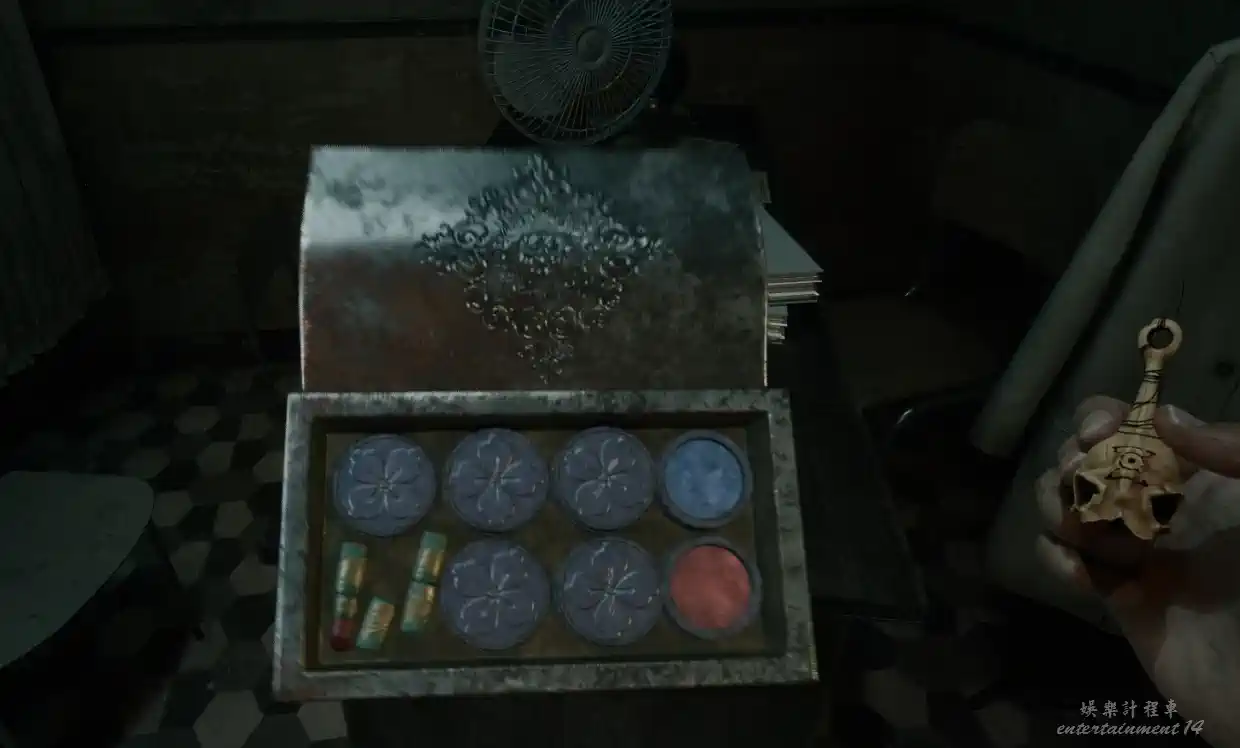 探索二層,房間外的櫃子裡獲得剪刀,在房間搜索發現手一樣的雕像,上鎖的工具窗,打磨機和一個箱子,打開箱子獲得第二枚徽章。