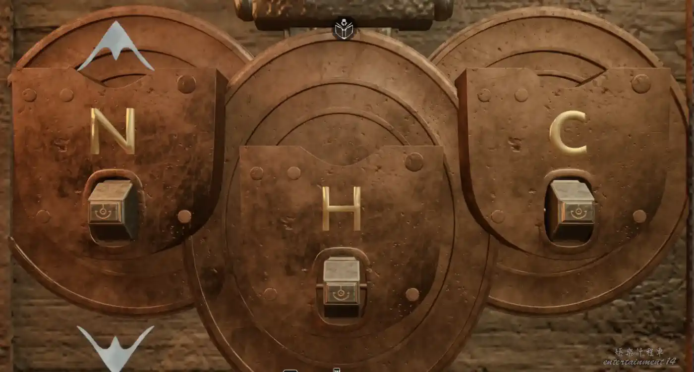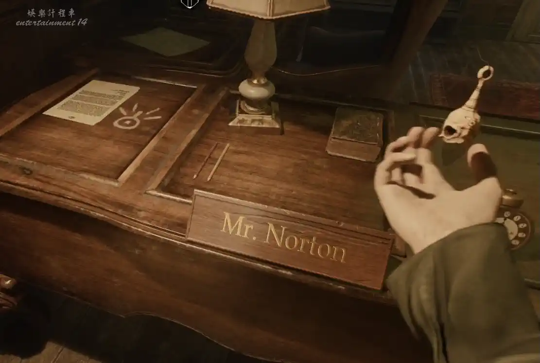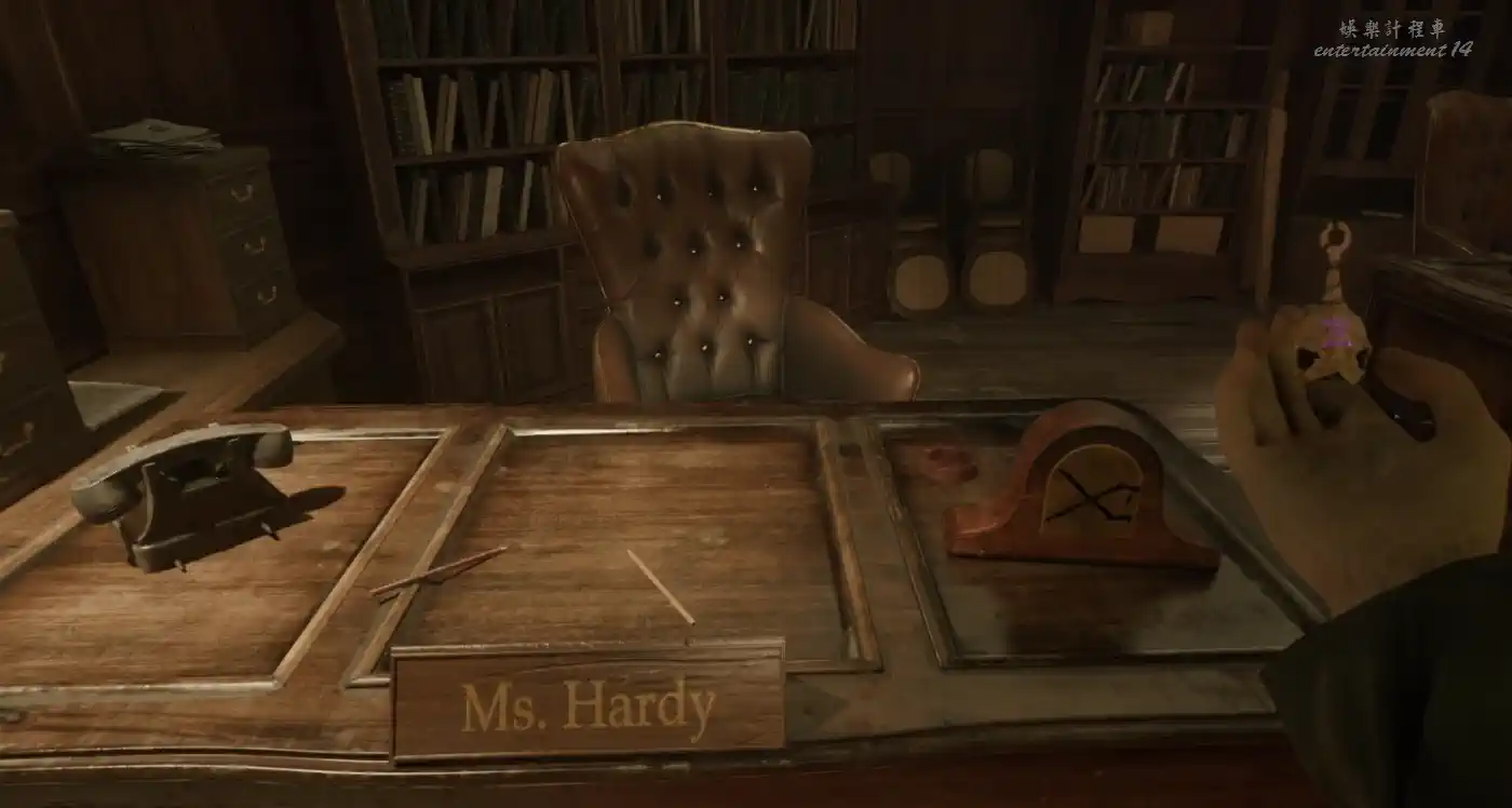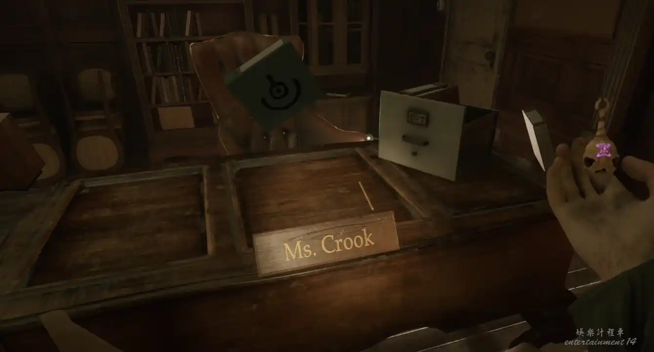 走到女孩頭朝向那一側的房間,發現三張桌子和一個密碼箱,桌上牌子分別寫著MS.Hardy、Mr.Norton、Ms.Crook。檢視密碼箱,可以發現三個字母H/N/C和特定符號,不難猜出是桌上名稱的首字母。