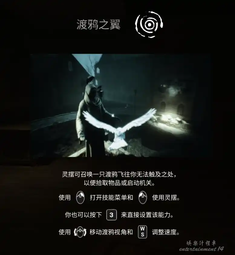 回到正門後用粉筆補全圖案,打開房門。靠近床位,撿起羽翼,使靈擺獲得第三種能力——渡鴉之翼。