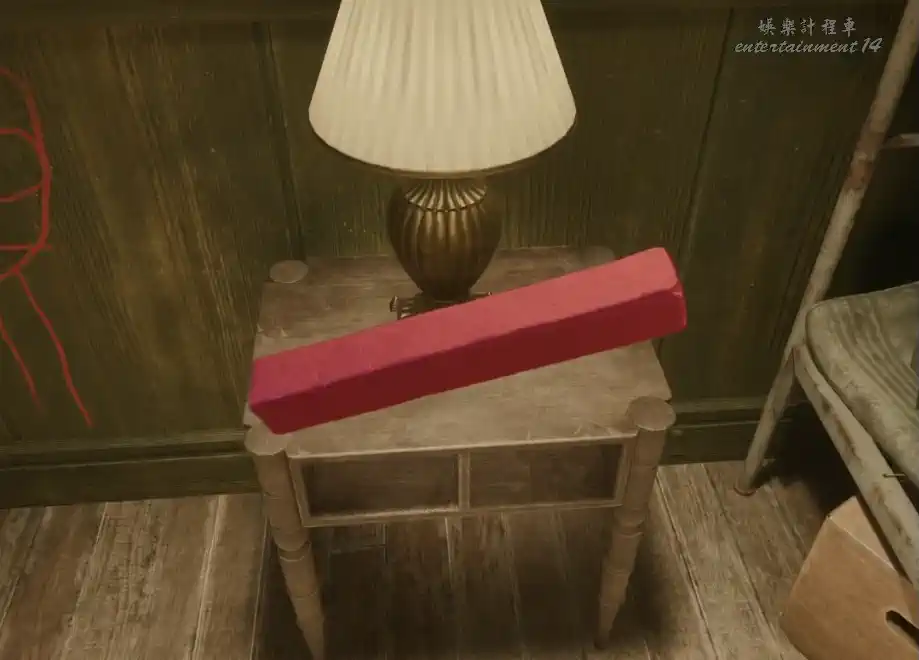 繼續向前探索。來到盡頭後,探索左側房間,有許多小孩床位,探索後發現粉筆,然後沿著週邊探索,可以通過窗戶發現另一層房間有撬棍,但拿不到。