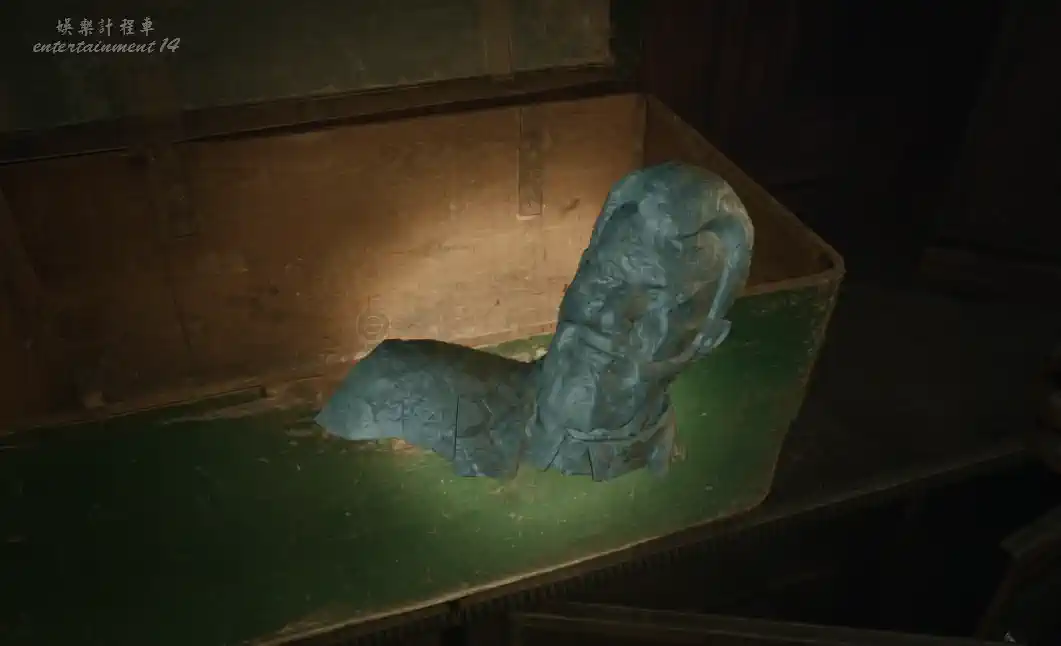 探索房間。發現密碼箱和一張字條提示,簡單來說就是找到數位,並按照順序輸入密碼,得到雕像頭部殘件。