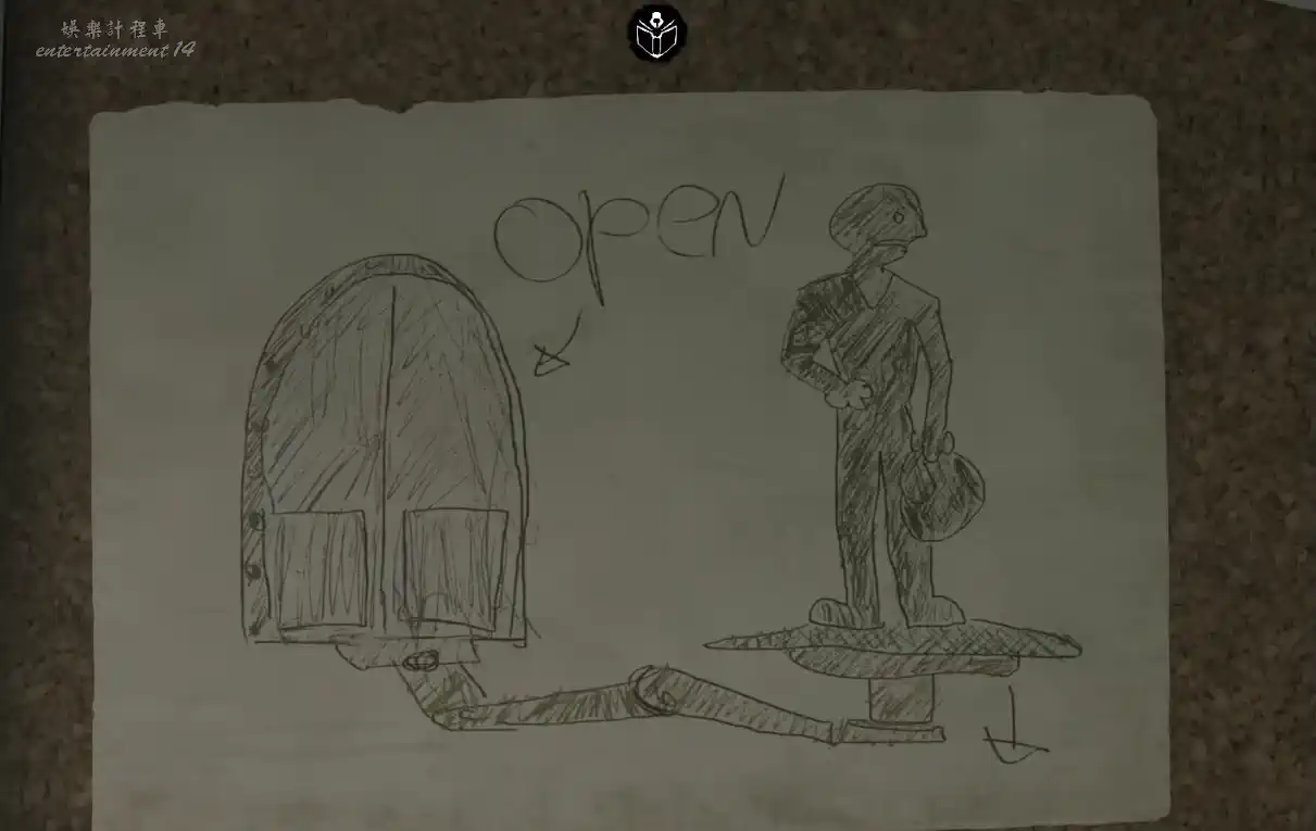 回到需要補全特殊圖案的房門,用粉筆補全(忘記可以打開記事本)。得到警報裝置。