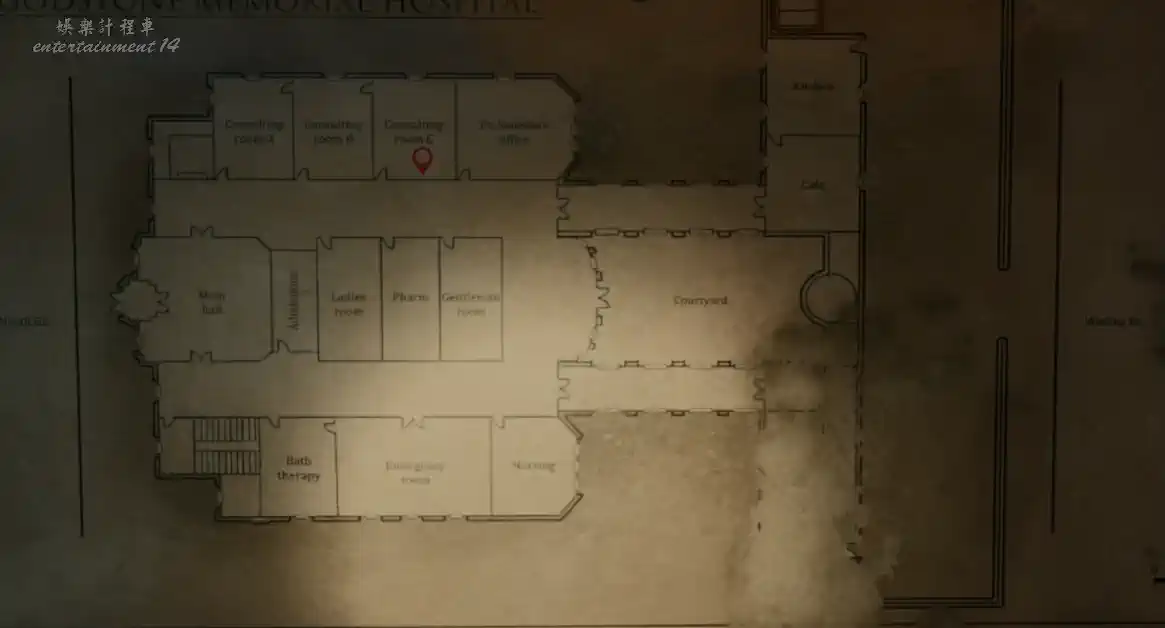 打開房間後鬼魂沖出,調查房間,獲得化妝盤和醫院地圖。此時走廊有Oliver和惠特尼兩隻鬼魂,記得避開。