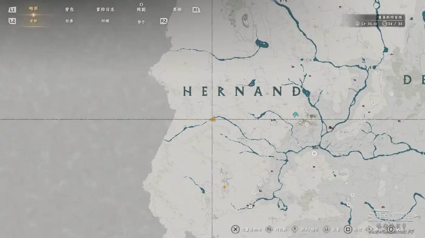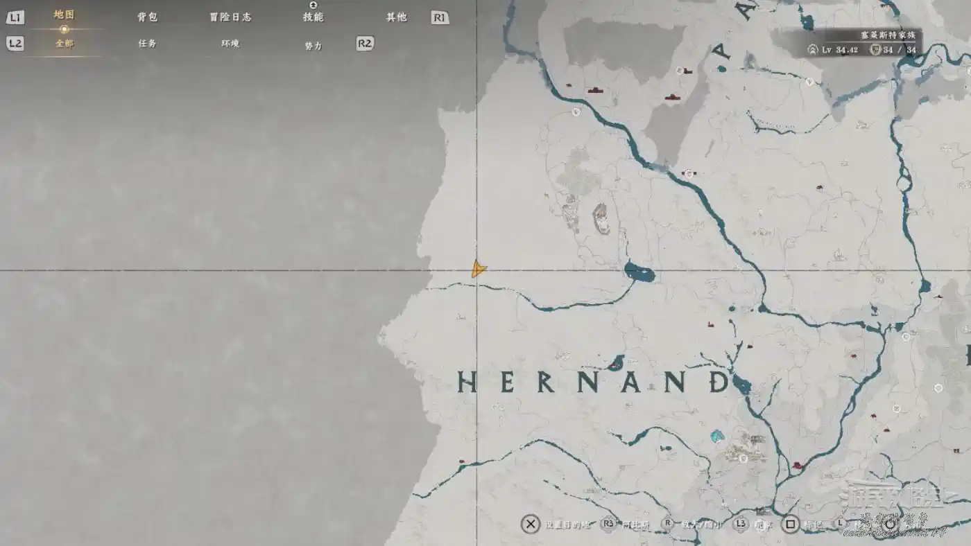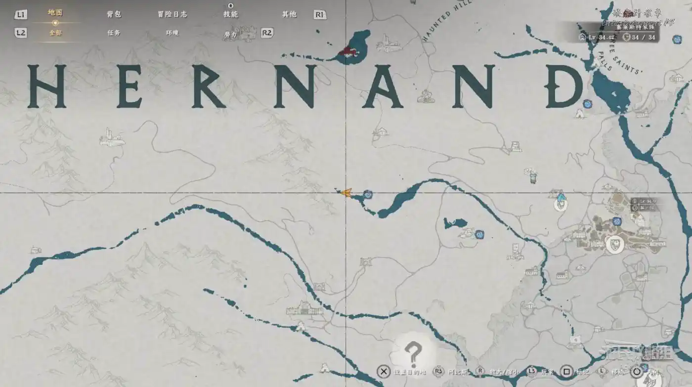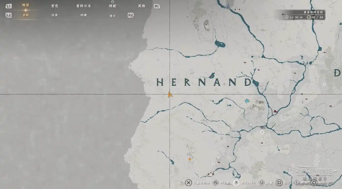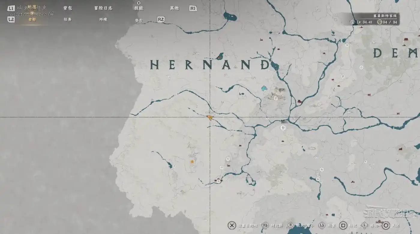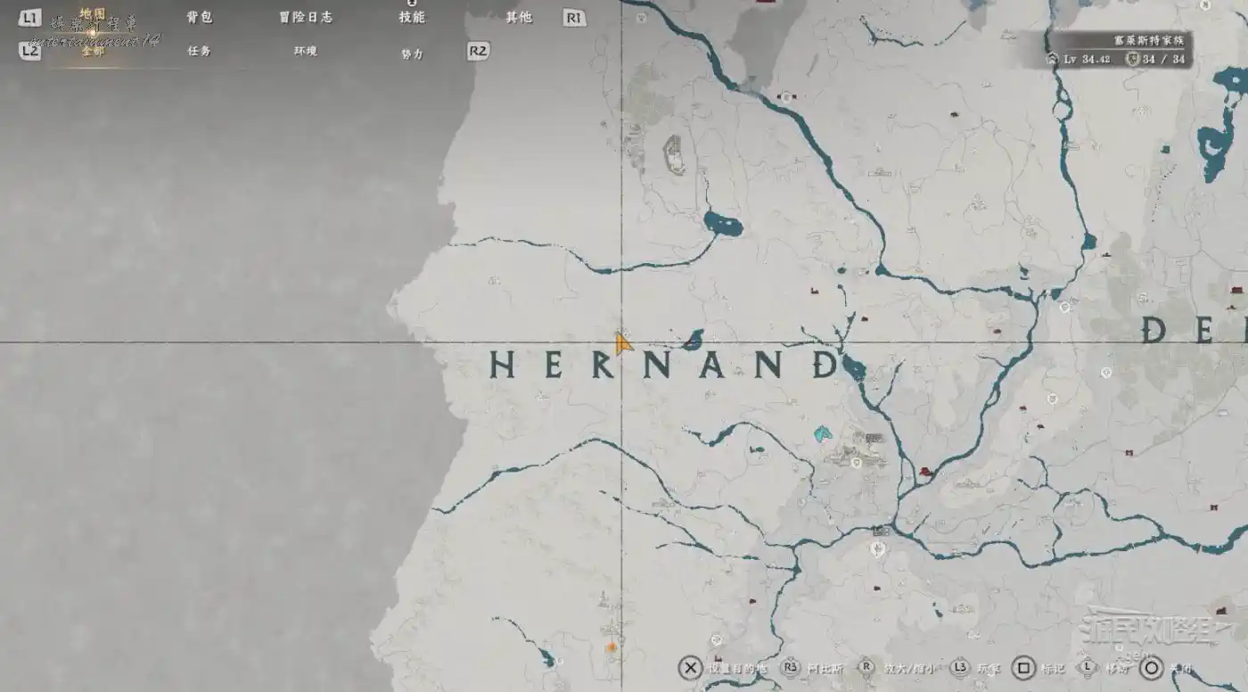 在埃爾南德南面下圖位置,用刺擊進入瀑布後面的洞窟,開寶箱拿到【暗巷統治者布制頭盔】。