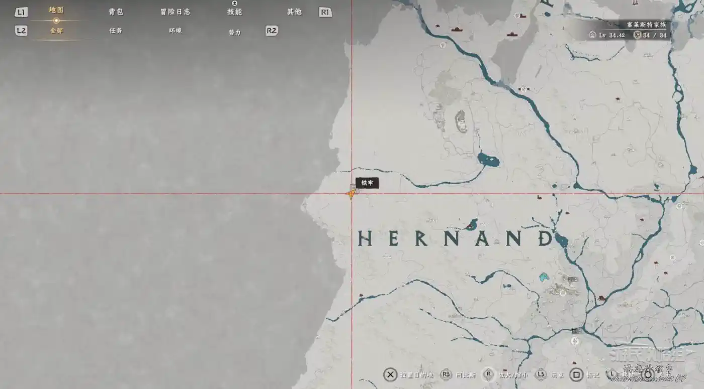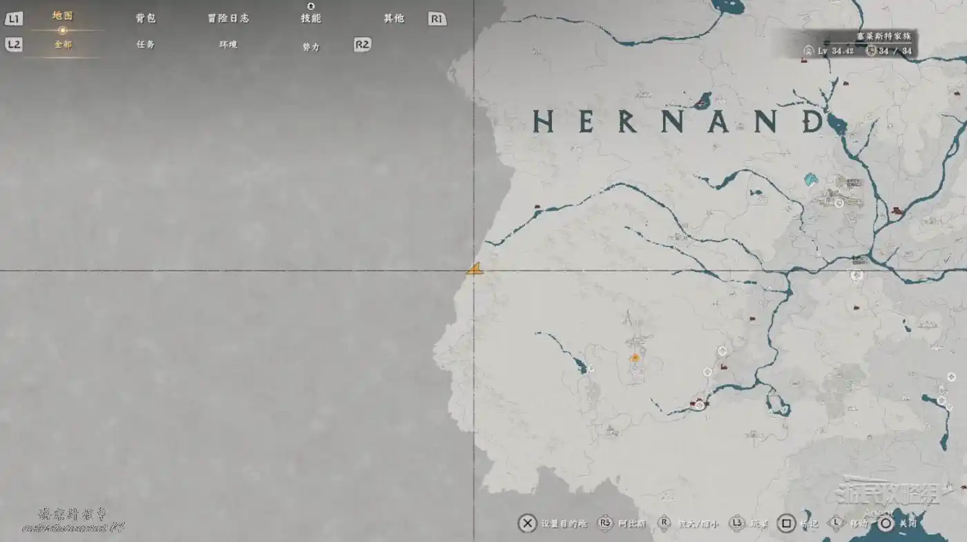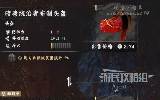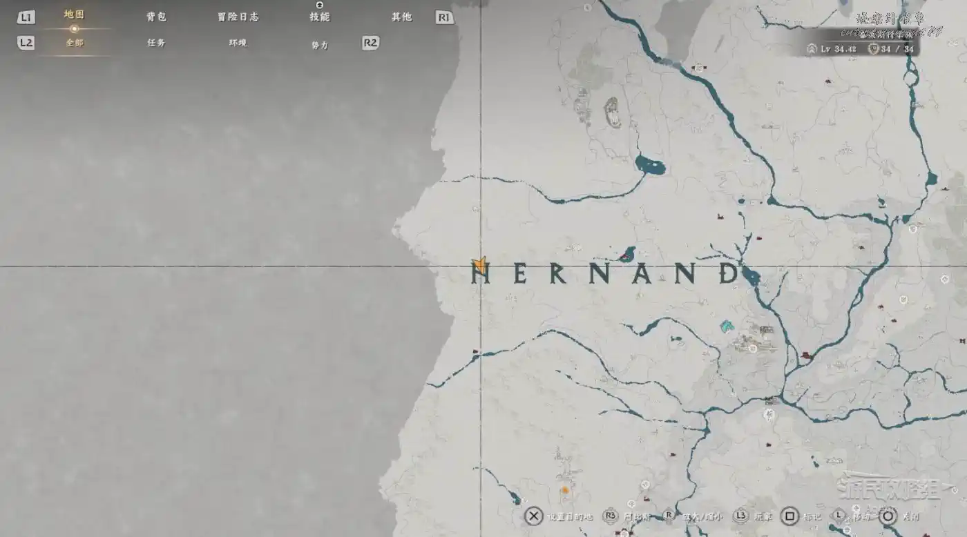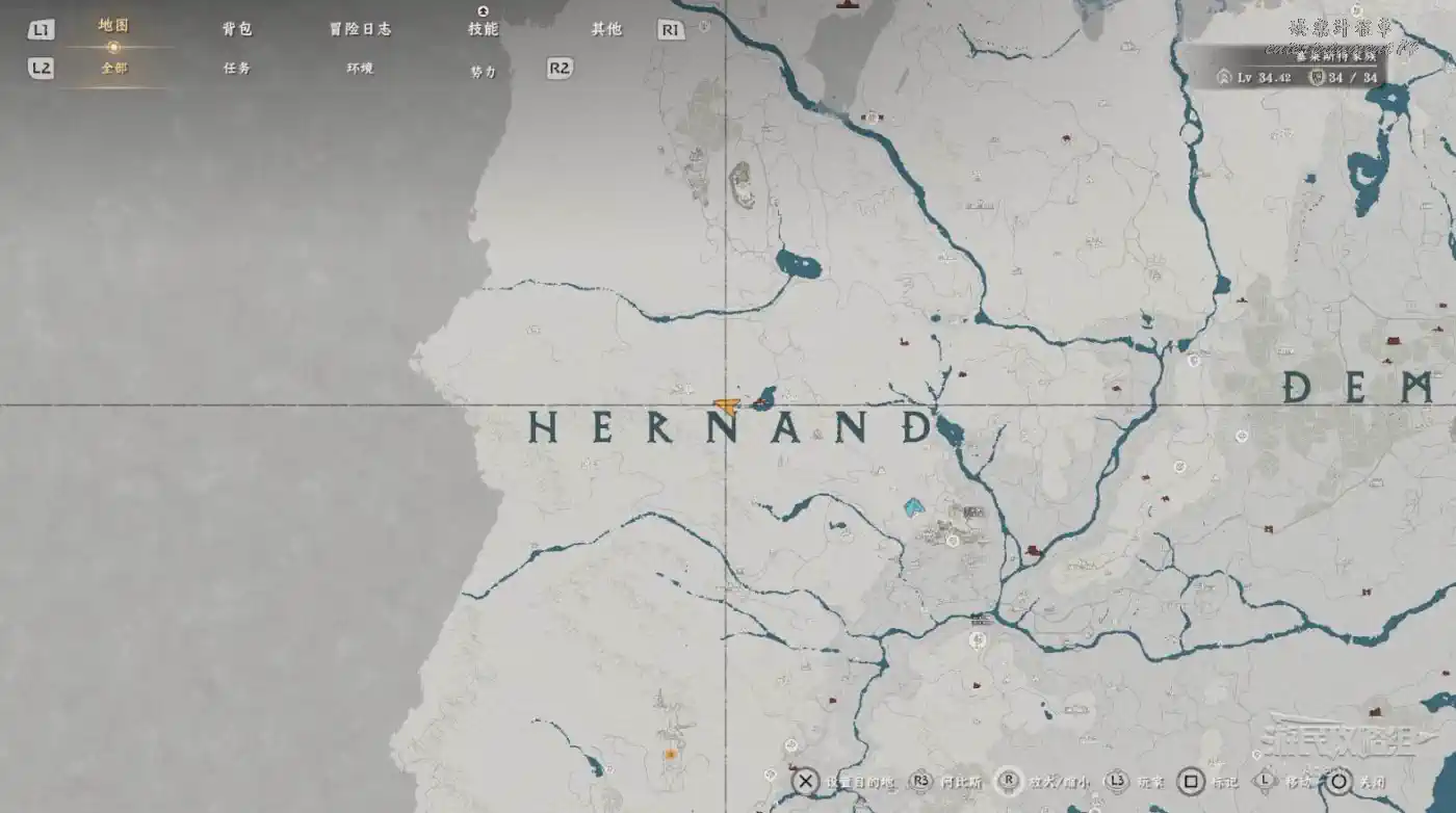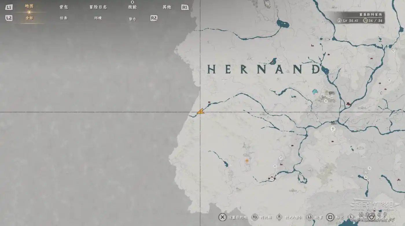在埃爾南德南面下圖位置,用刺擊進入瀑布後面的洞窟,開寶箱拿到【暗巷統治者布制頭盔】。