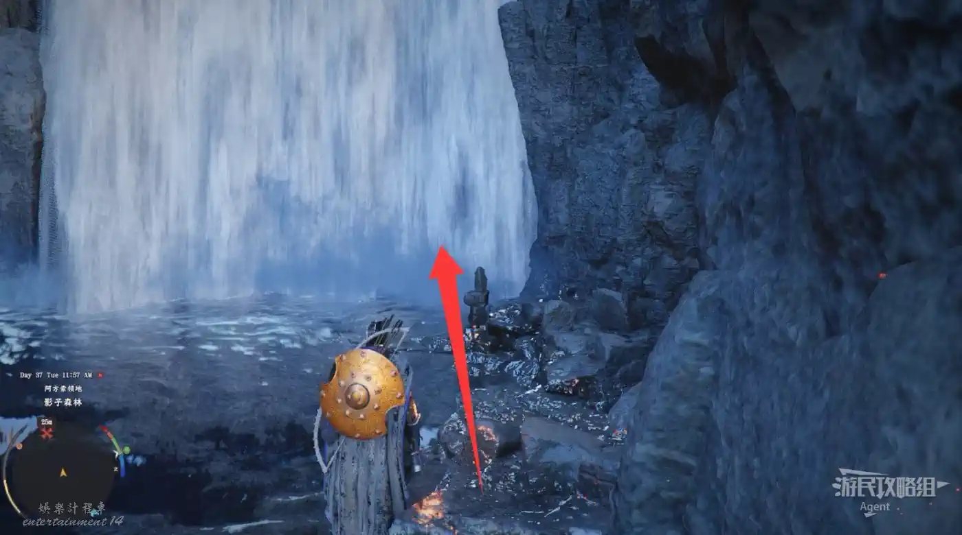 在佩倫下圖位置,用刺擊進入瀑布後面的洞窟,開寶箱拿到【阿夏德板金鞋子】。