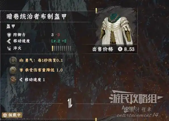 在埃爾南德南面下圖位置,用刺擊進入瀑布後面的洞窟,開寶箱拿到【暗巷統治者布制盔甲】。