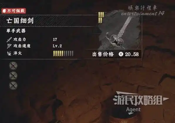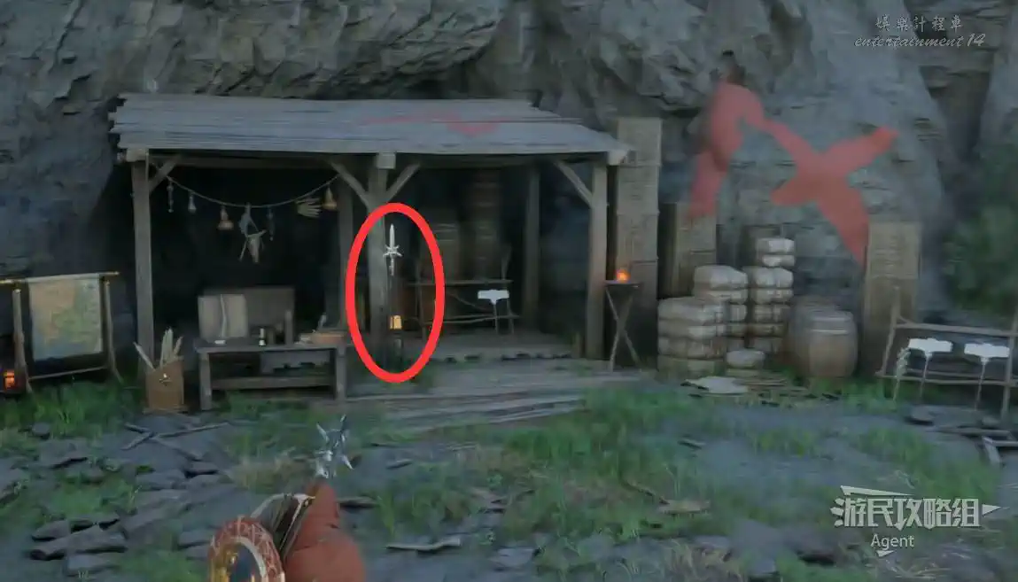 鑽進洞裡砍碎木板,開寶箱拿到【失落王國的皮質披風】。寶箱旁的木桶處拿到【亡國細劍】。
