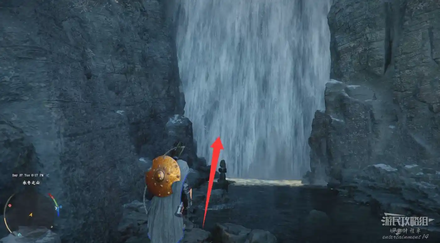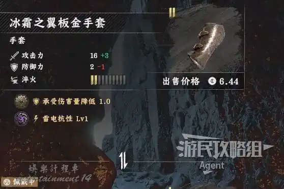 在佩倫下圖位置,用刺擊進入瀑布後面的洞窟,開寶箱拿到【冰霜之翼板金手套】。