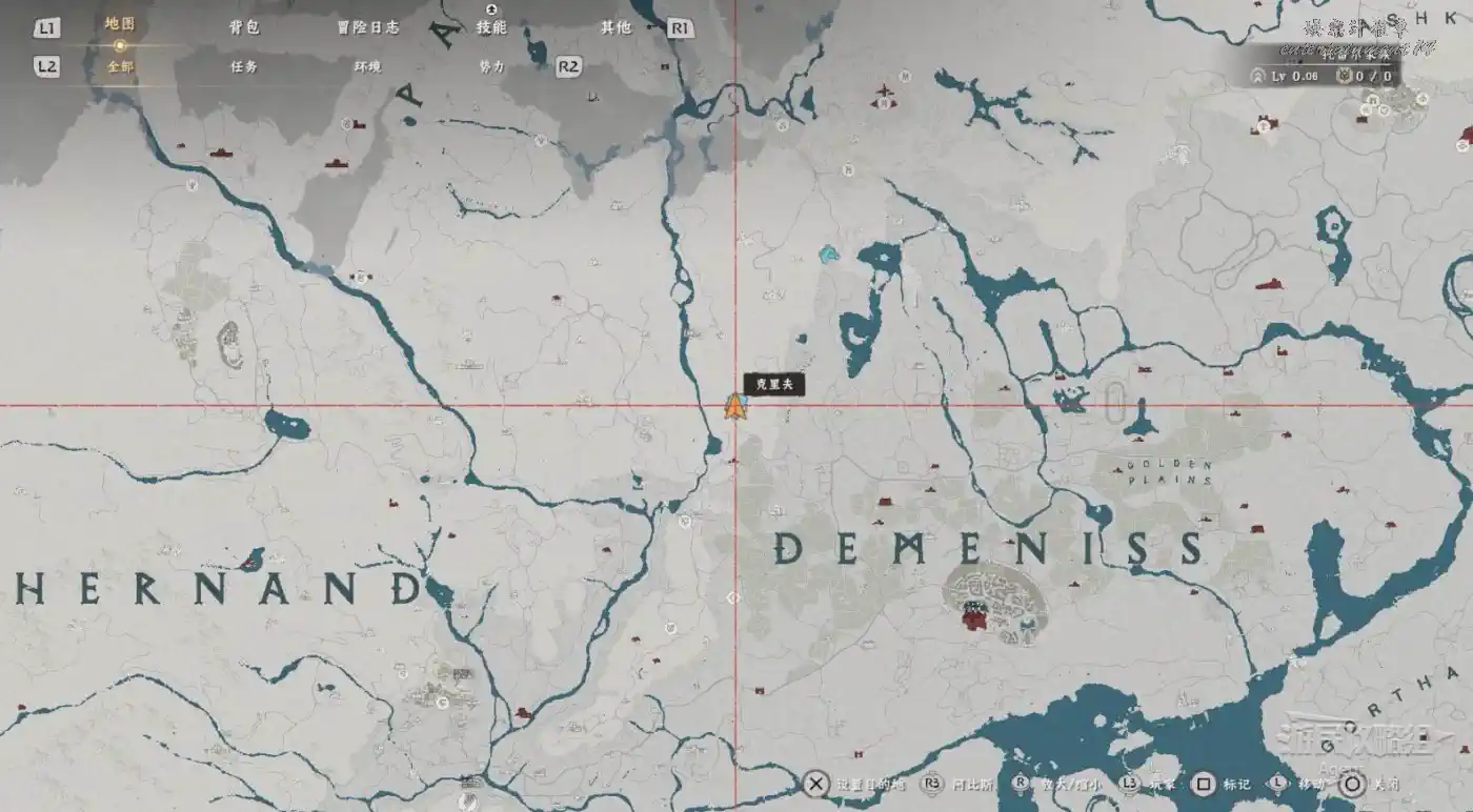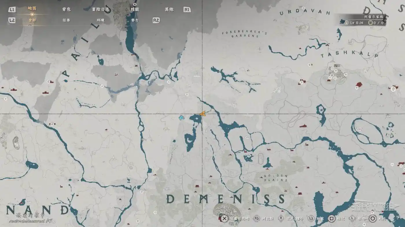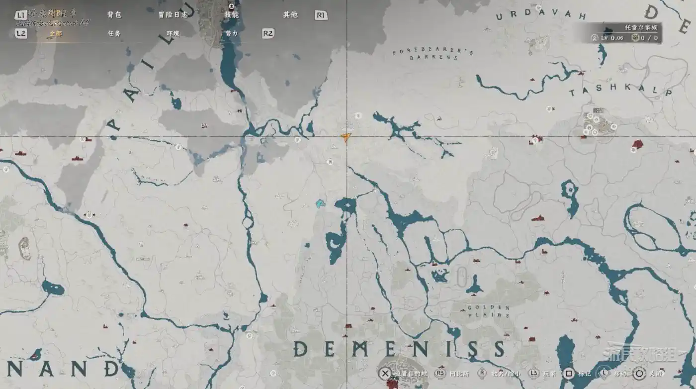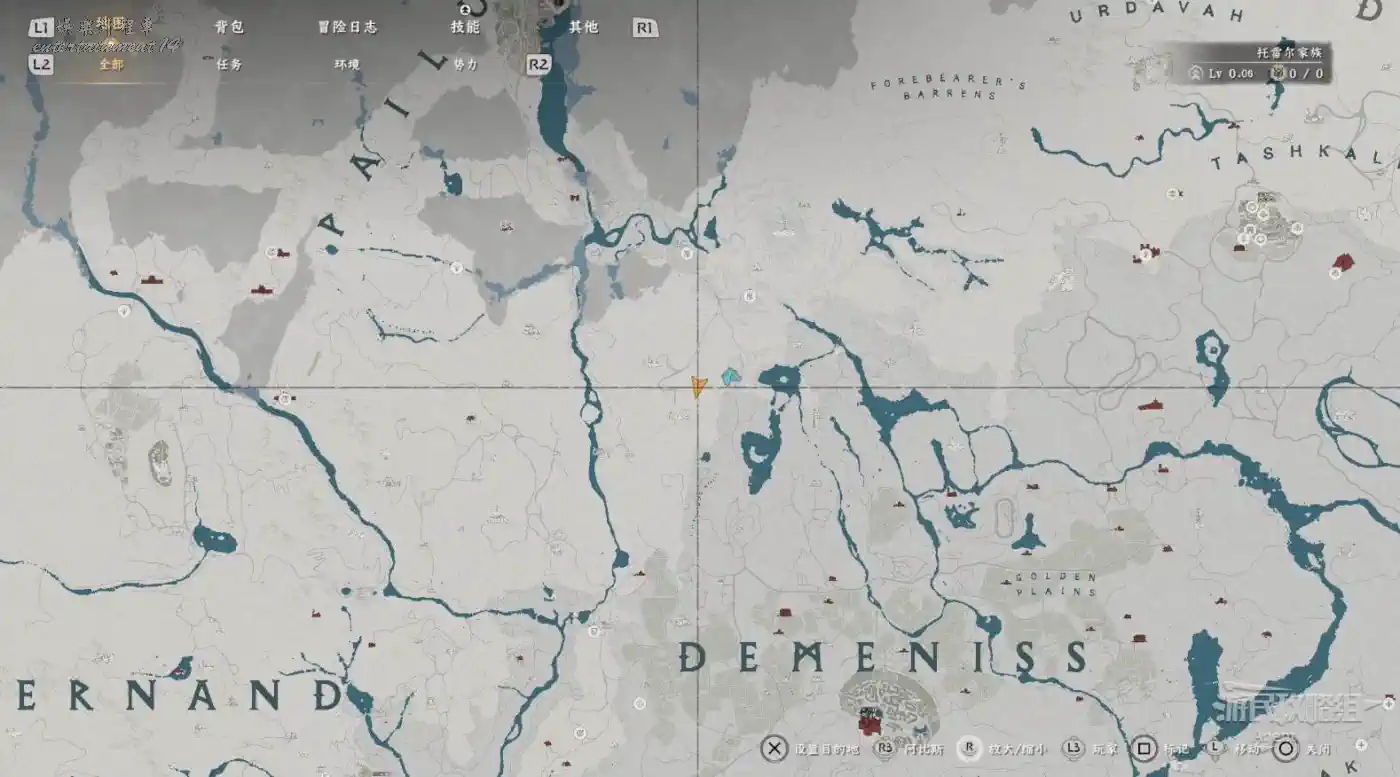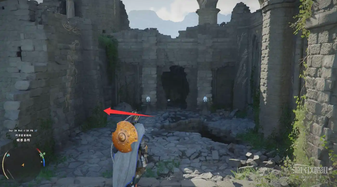 在德梅尼斯北面,下圖位置的遺跡裡,下圖左邊洞裡有藤蔓,舉劍聚光燒掉藤蔓,進洞開寶箱拿到【霜降詛咒板金披風】。然後傳送出來。