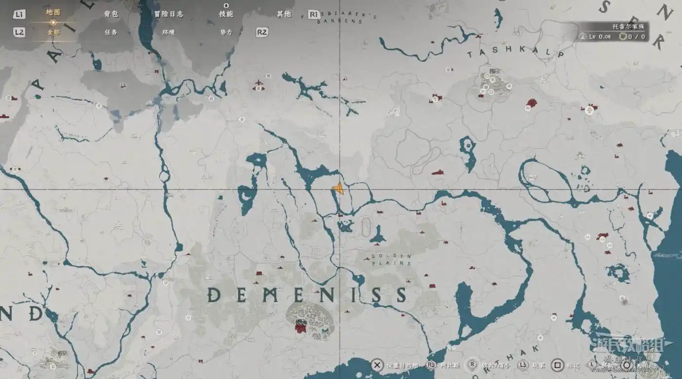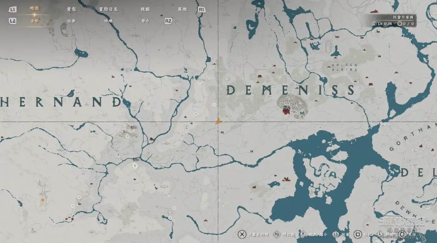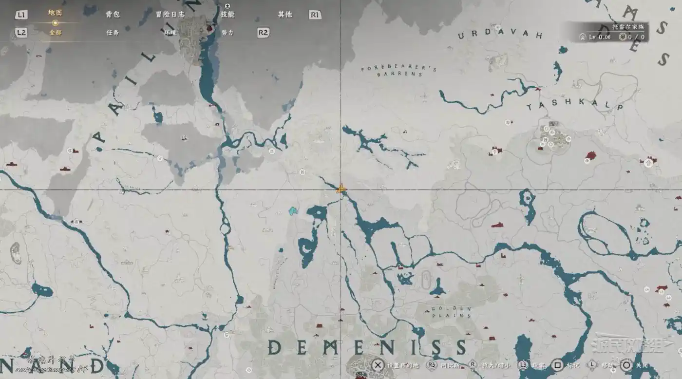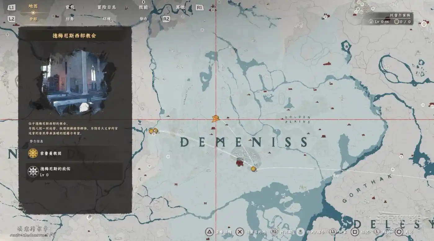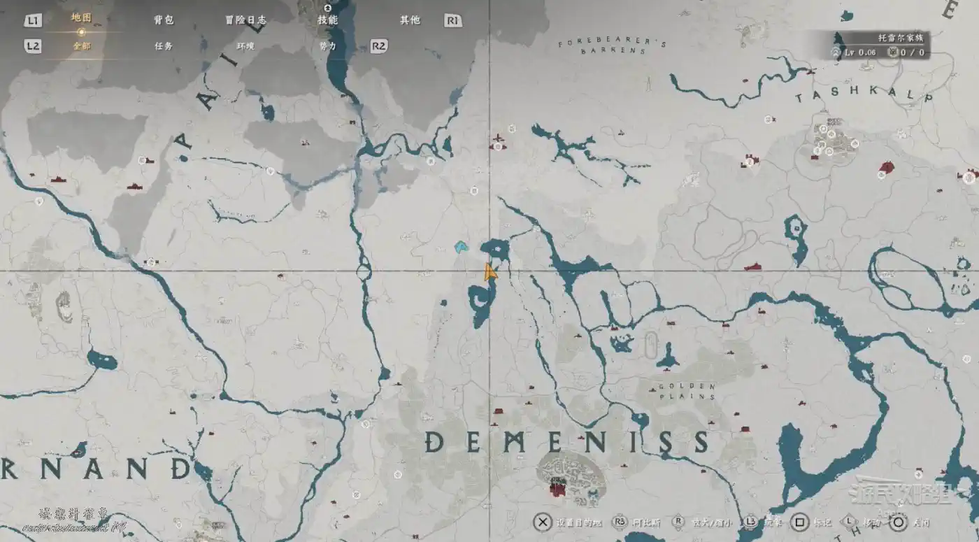 在德梅尼斯北面,下圖位置的遺跡裡,下圖左邊洞裡有藤蔓,舉劍聚光燒掉藤蔓,進洞開寶箱拿到【霜降詛咒板金披風】。然後傳送出來。