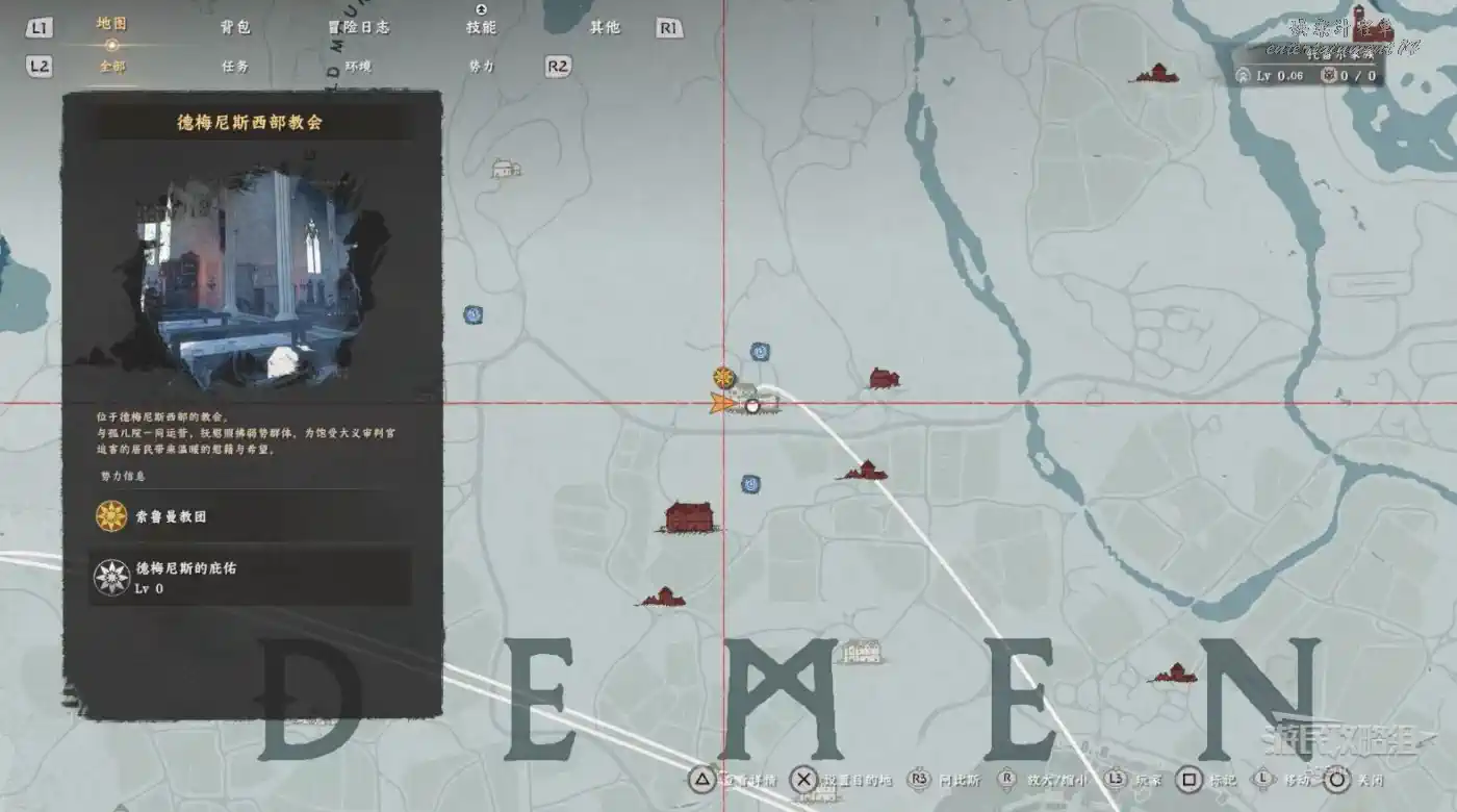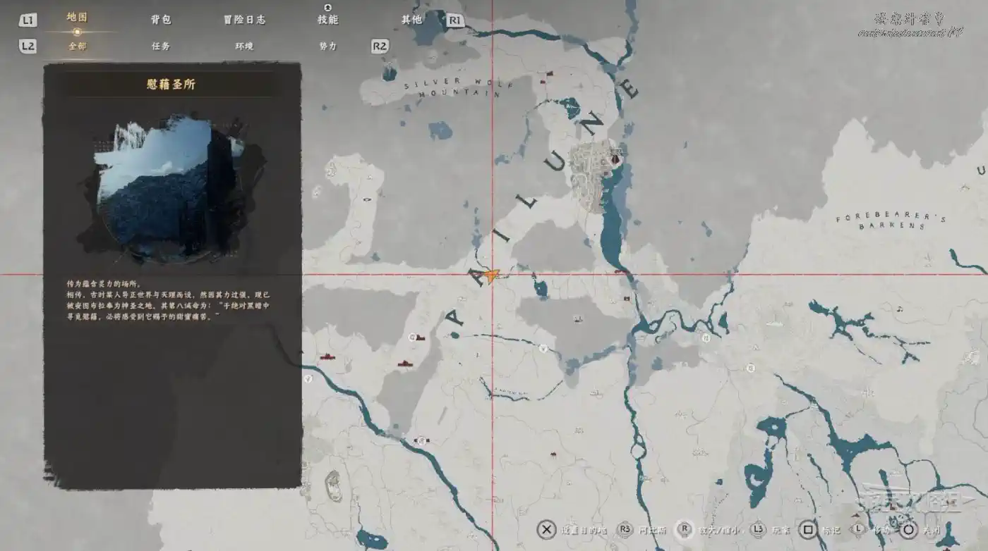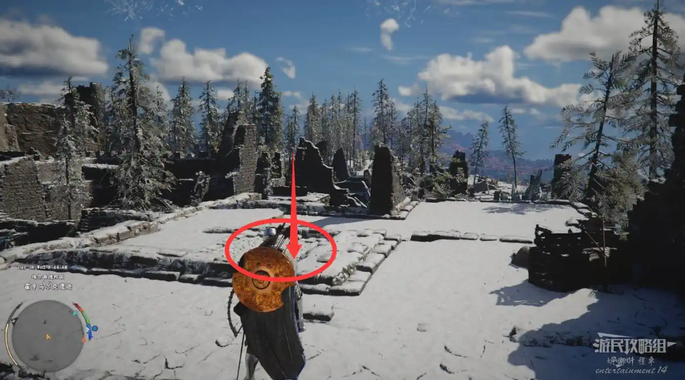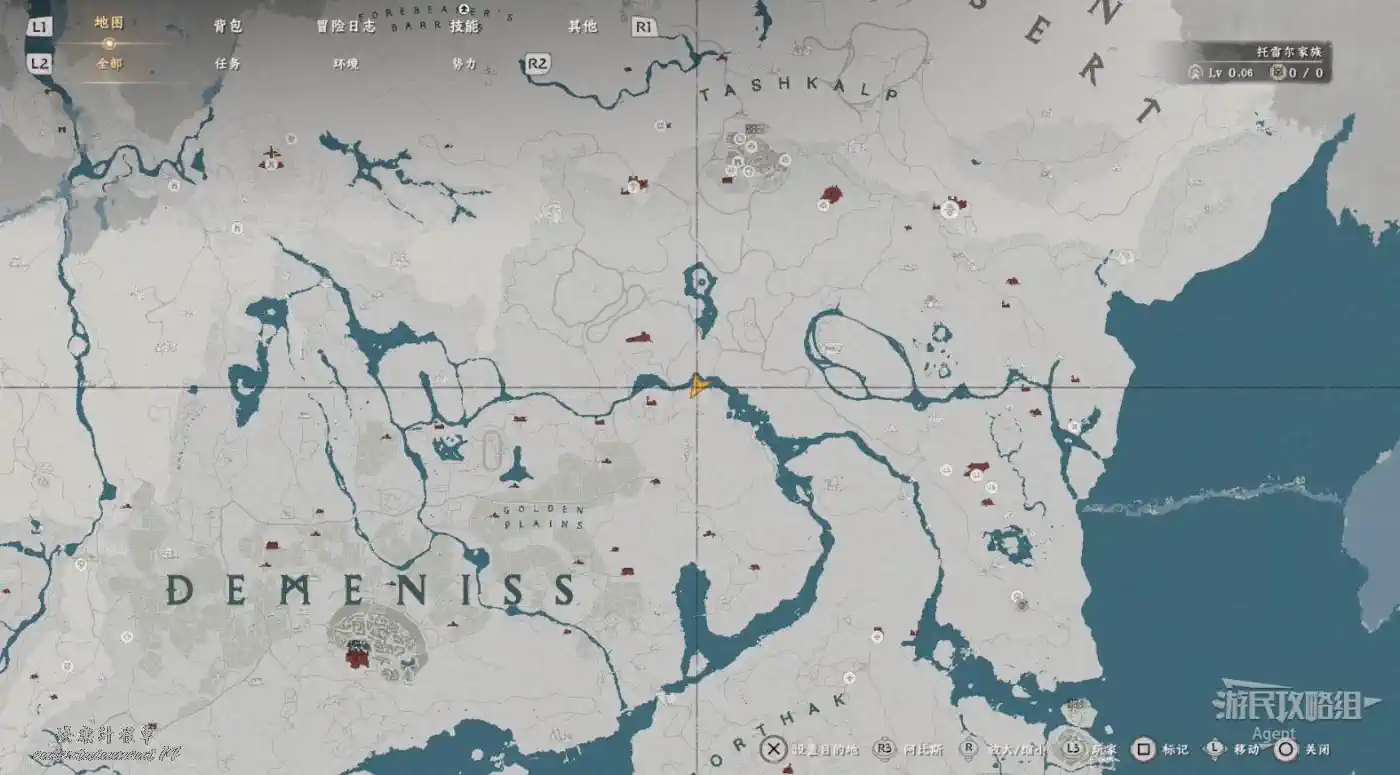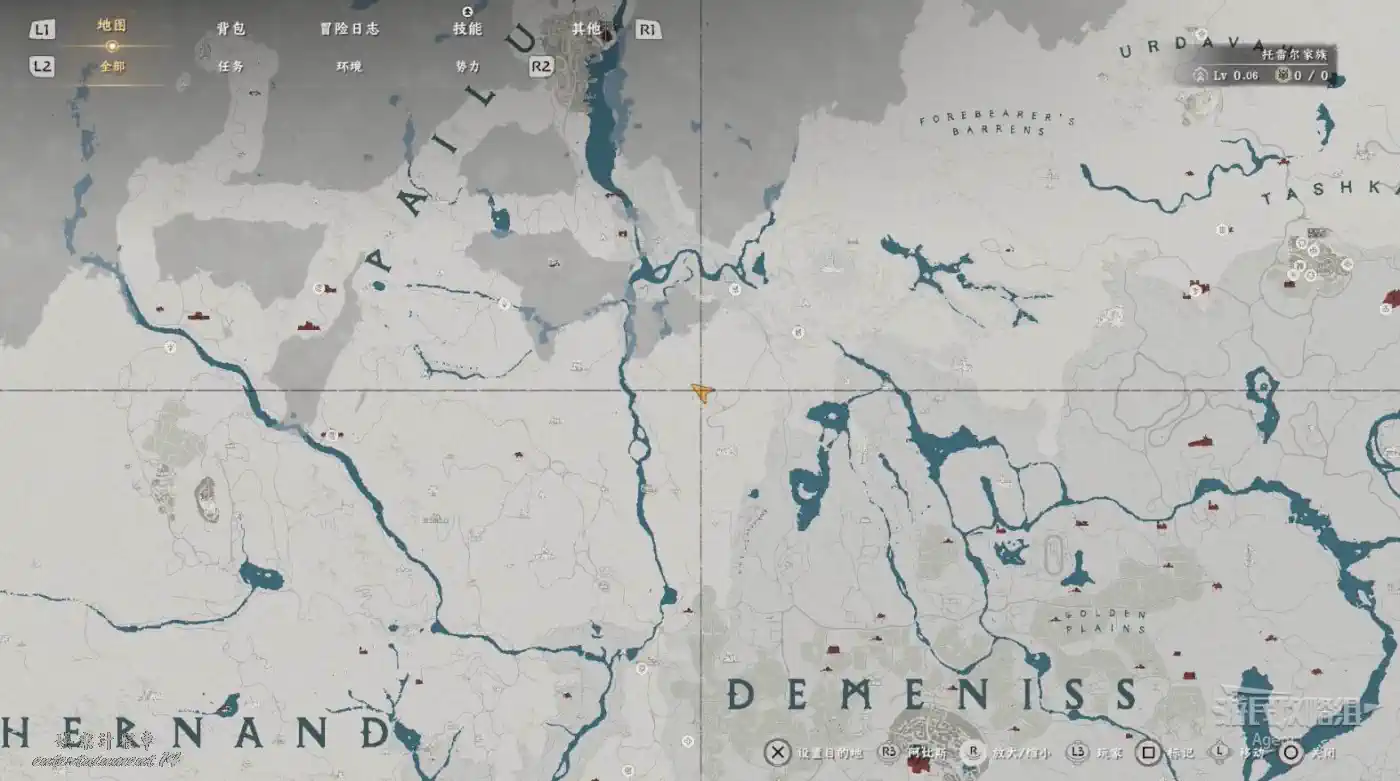 在德梅尼斯北面,下圖位置的遺跡裡,下圖左邊洞裡有藤蔓,舉劍聚光燒掉藤蔓,進洞開寶箱拿到【霜降詛咒板金披風】。然後傳送出來。