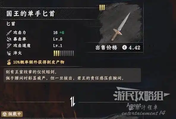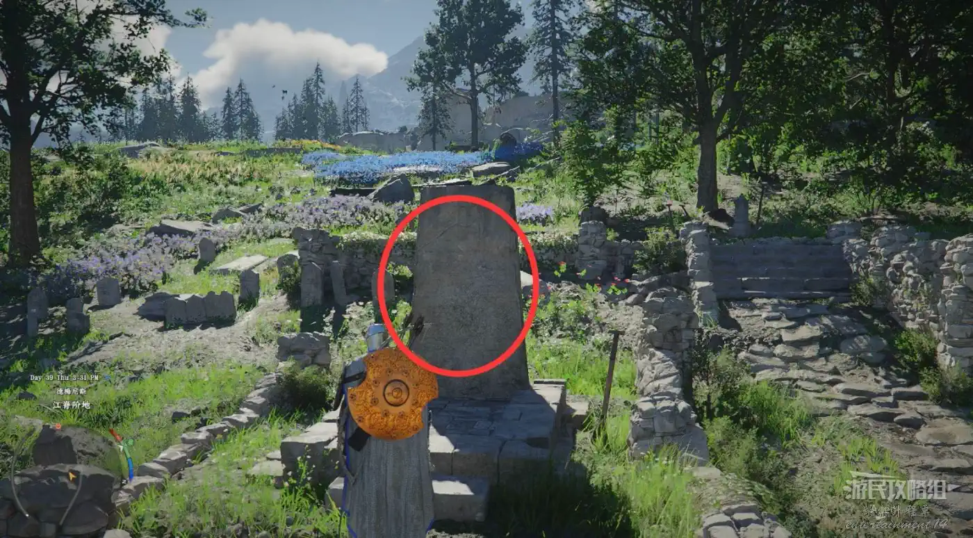 在佩倫下圖位置,對墓碑用勁法打開地洞,到地洞裡開寶箱拿到【國王的單手匕首】。