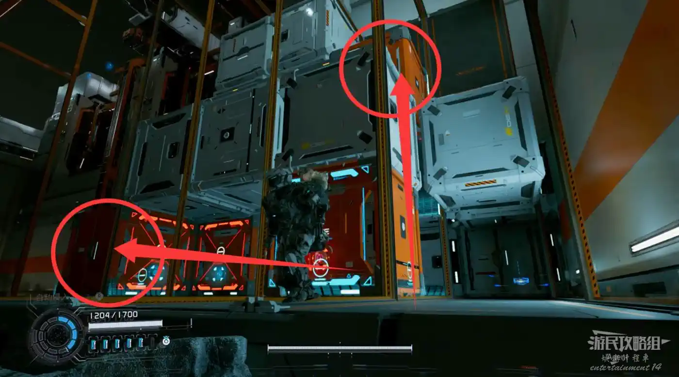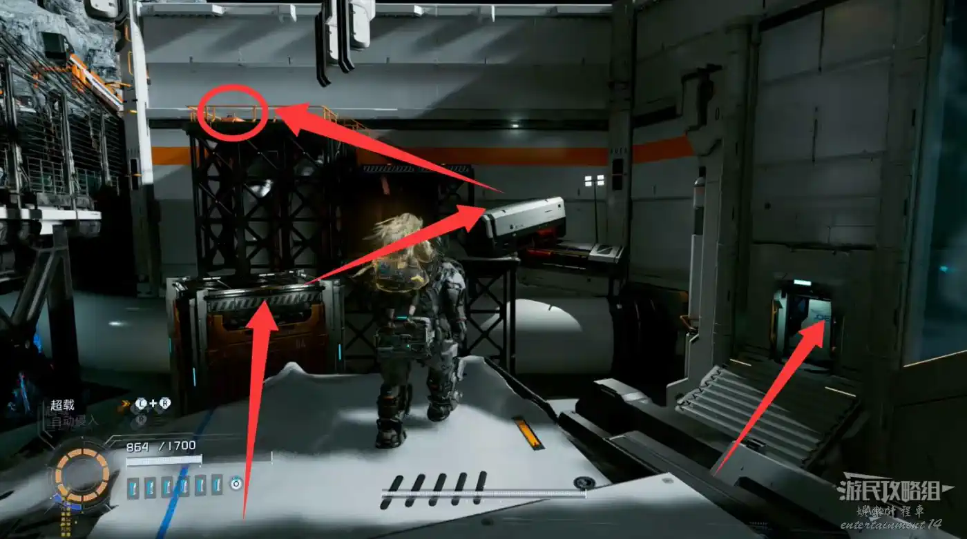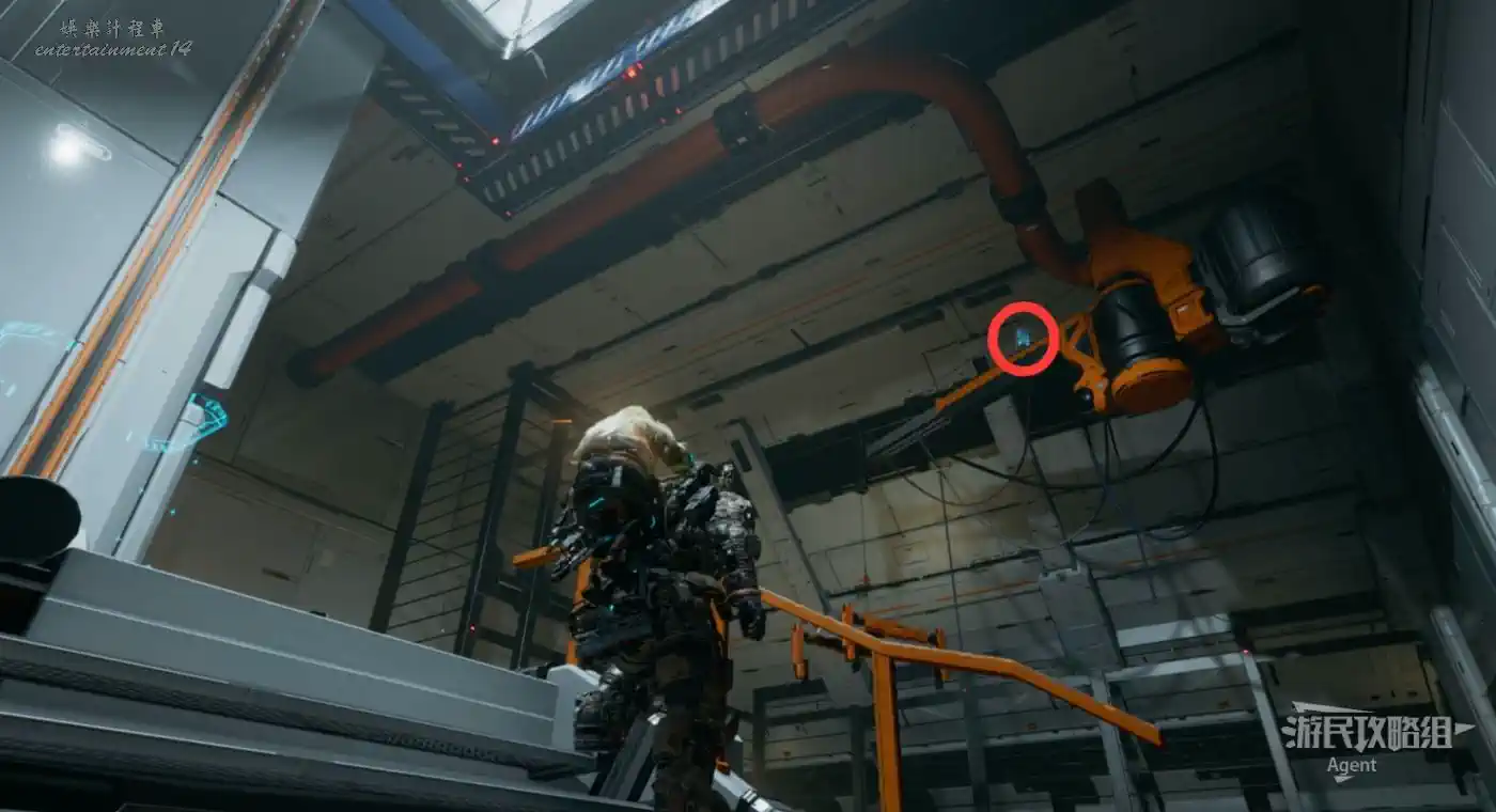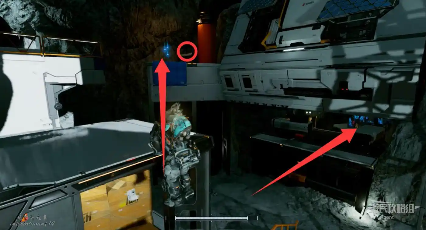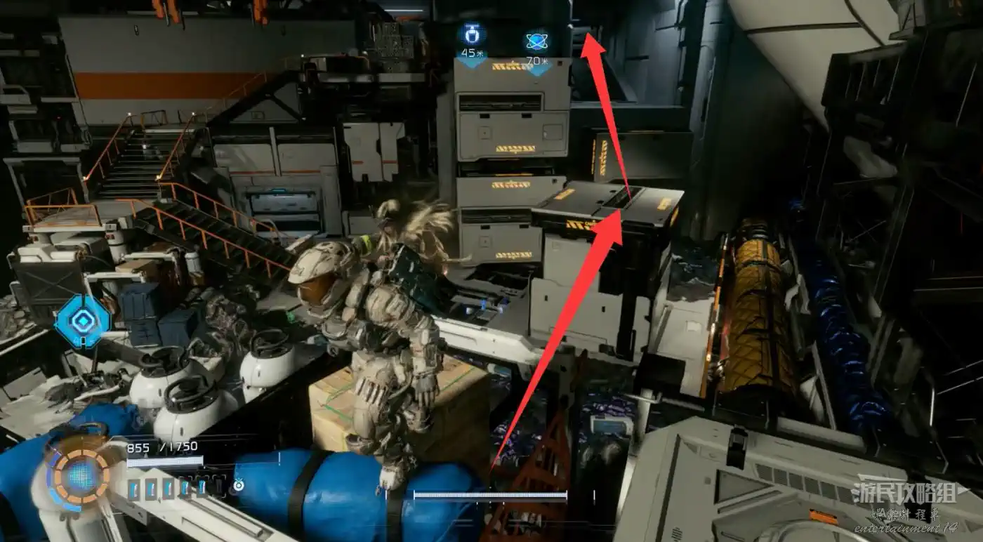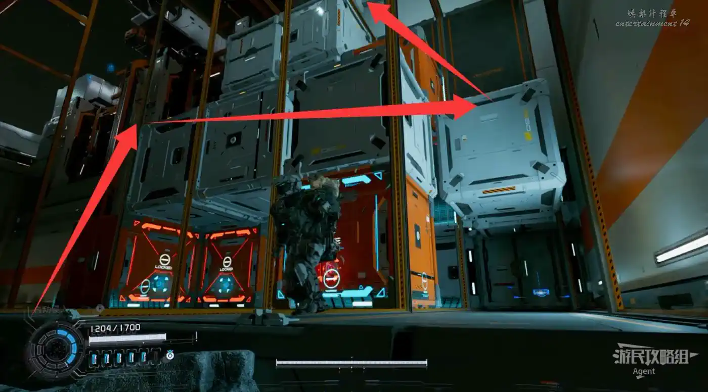 下來消滅敵人後注意,破解牆上紅圈可升級平台,站在平台上,可拿到高處的【升級組件】。然後往前走到頭拿保險箱。