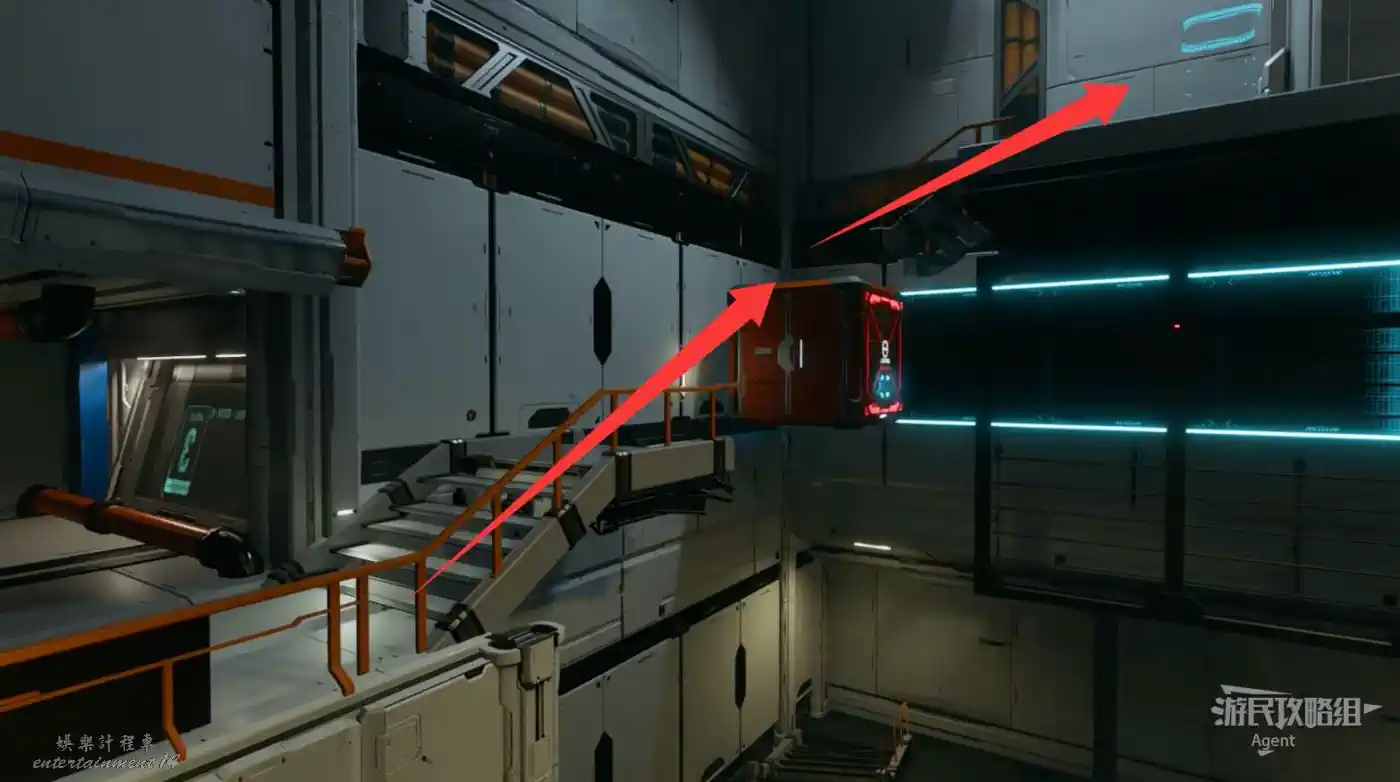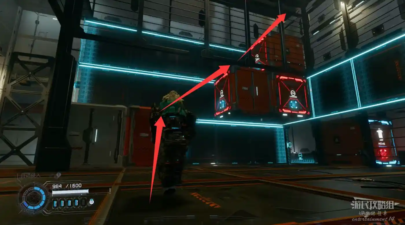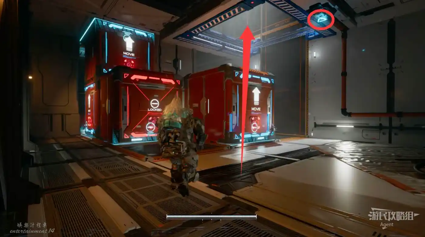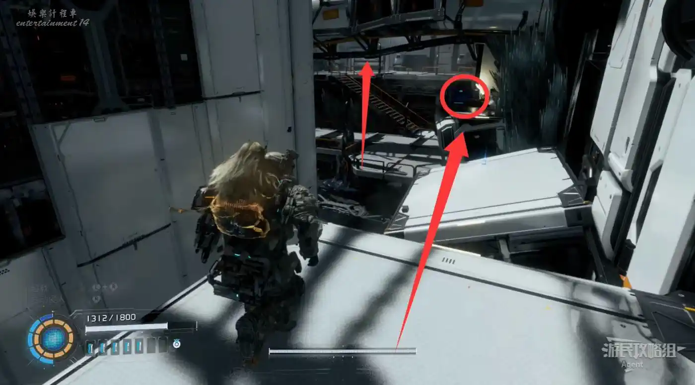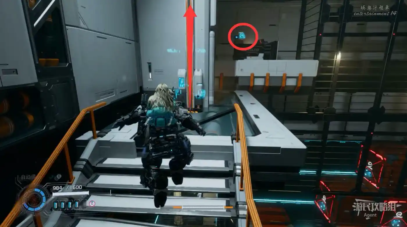 下來消滅敵人後注意,破解牆上紅圈可升級平台,站在平台上,可拿到高處的【升級組件】。然後往前走到頭拿保險箱。