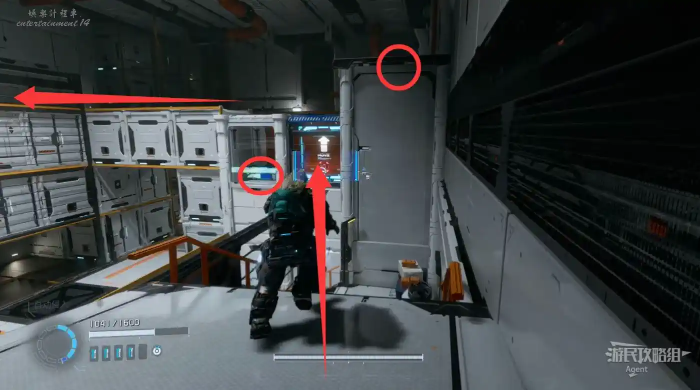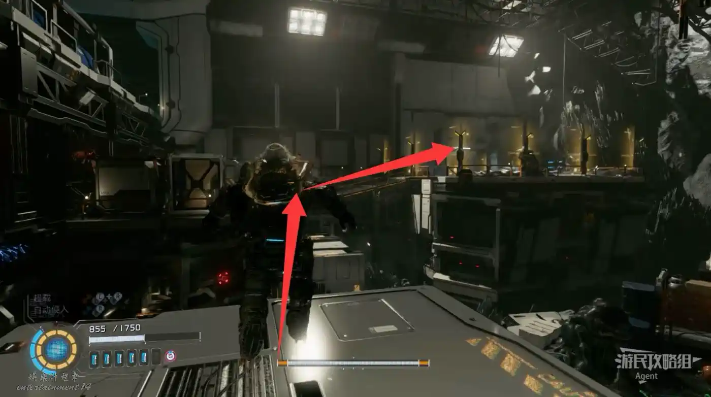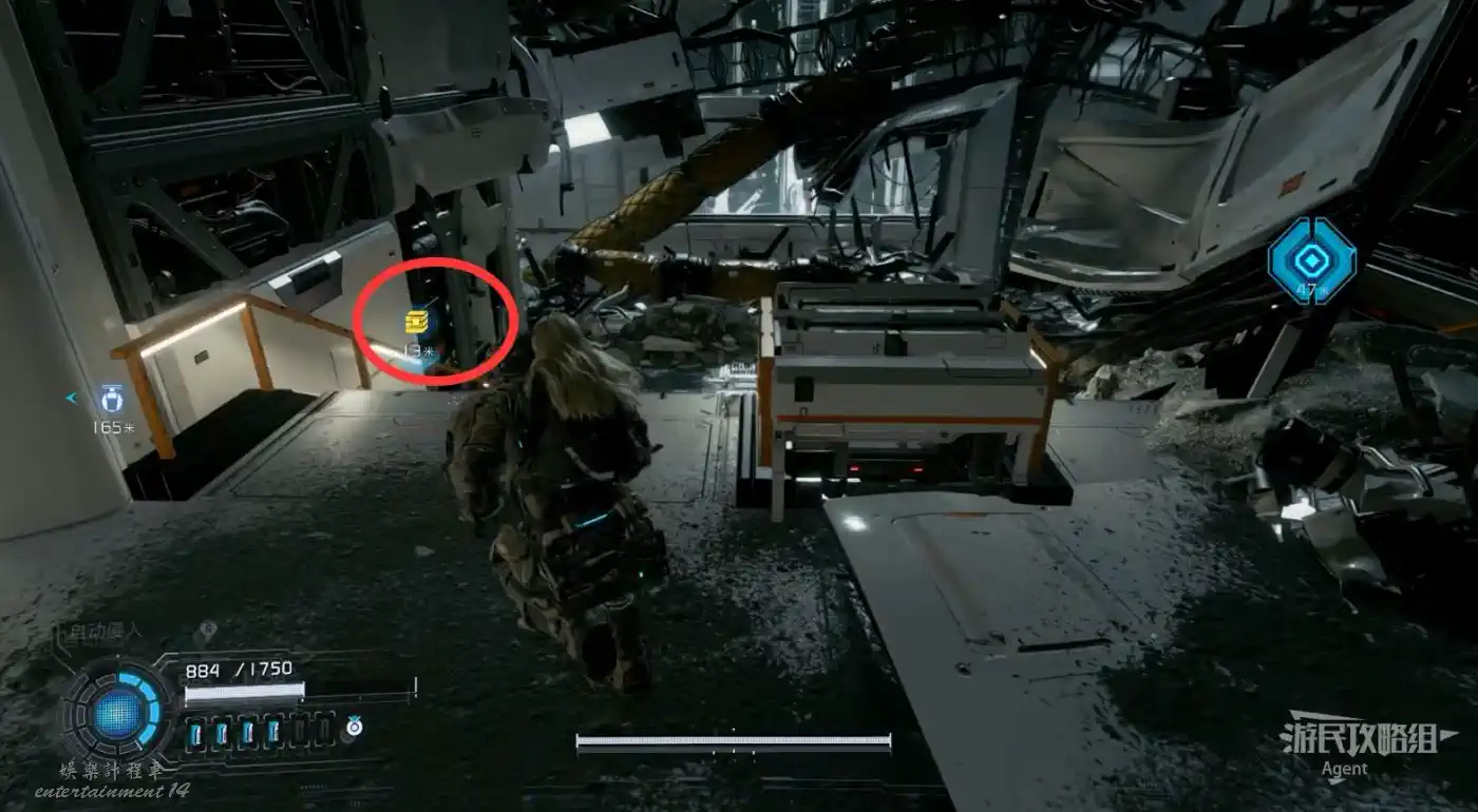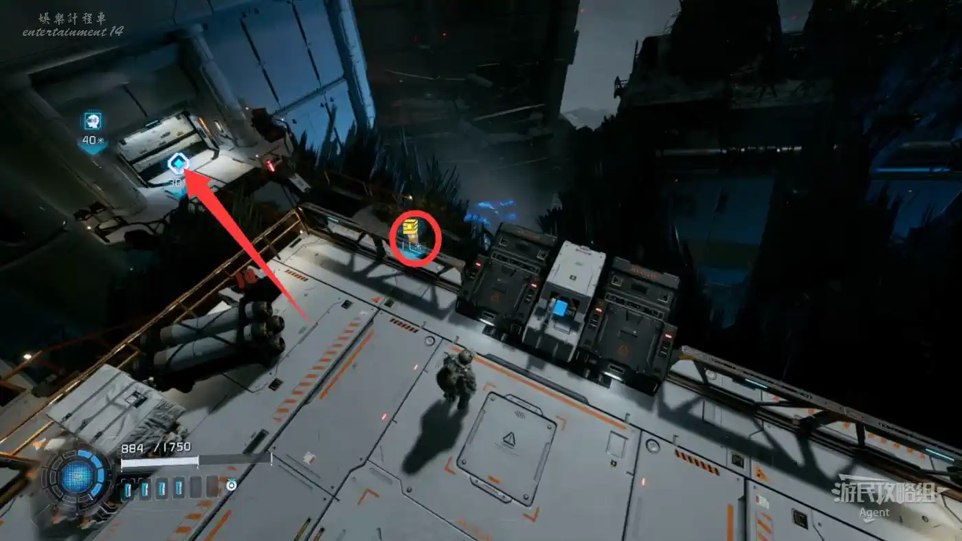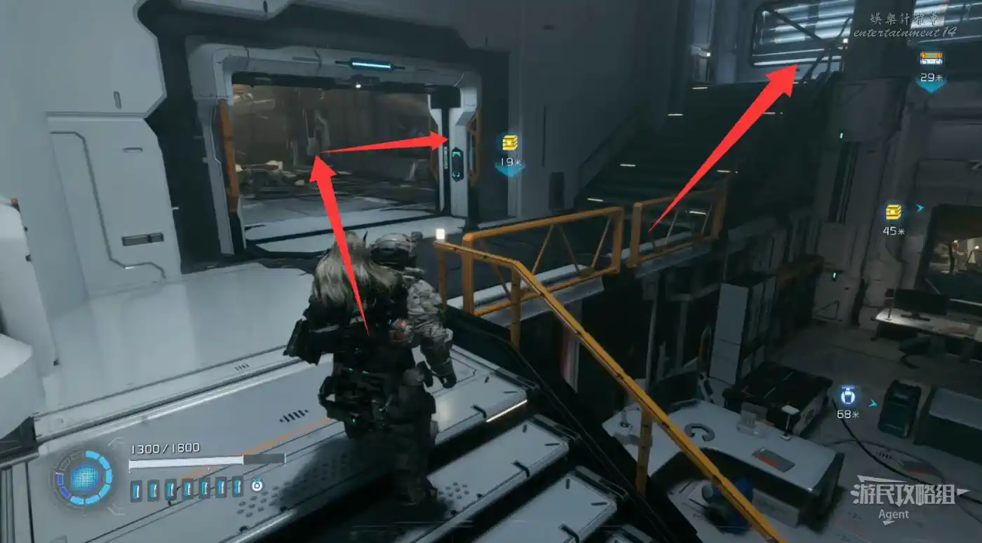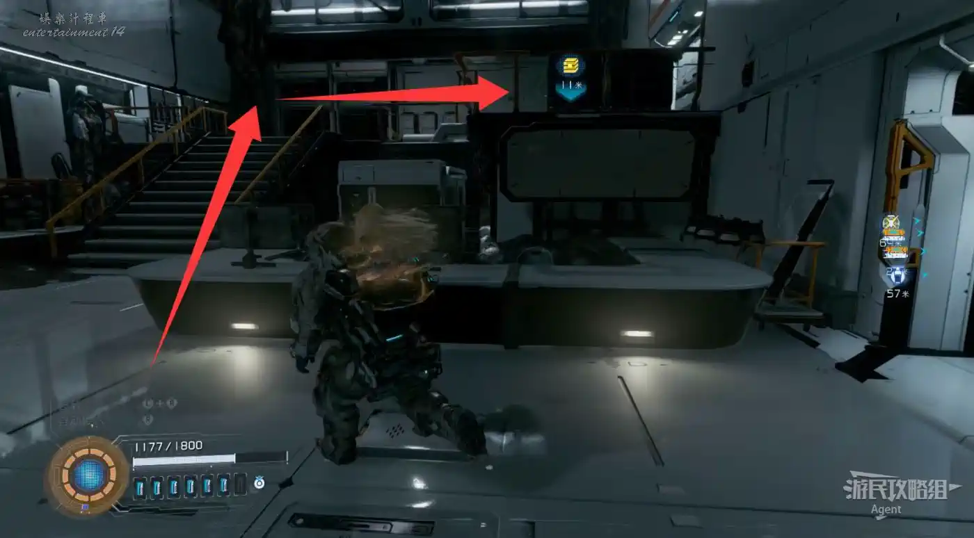 下來消滅敵人後注意,破解牆上紅圈可升級平台,站在平台上,可拿到高處的【升級組件】。然後往前走到頭拿保險箱。