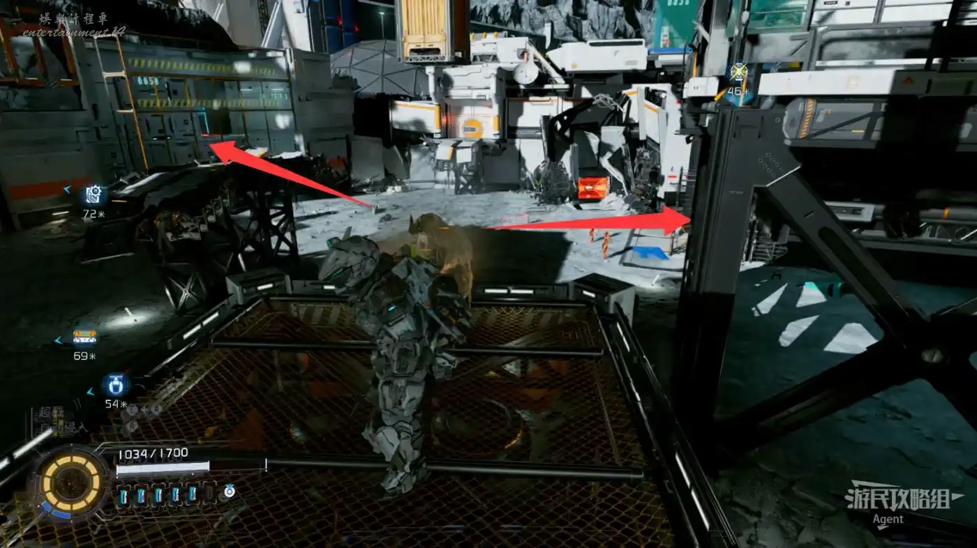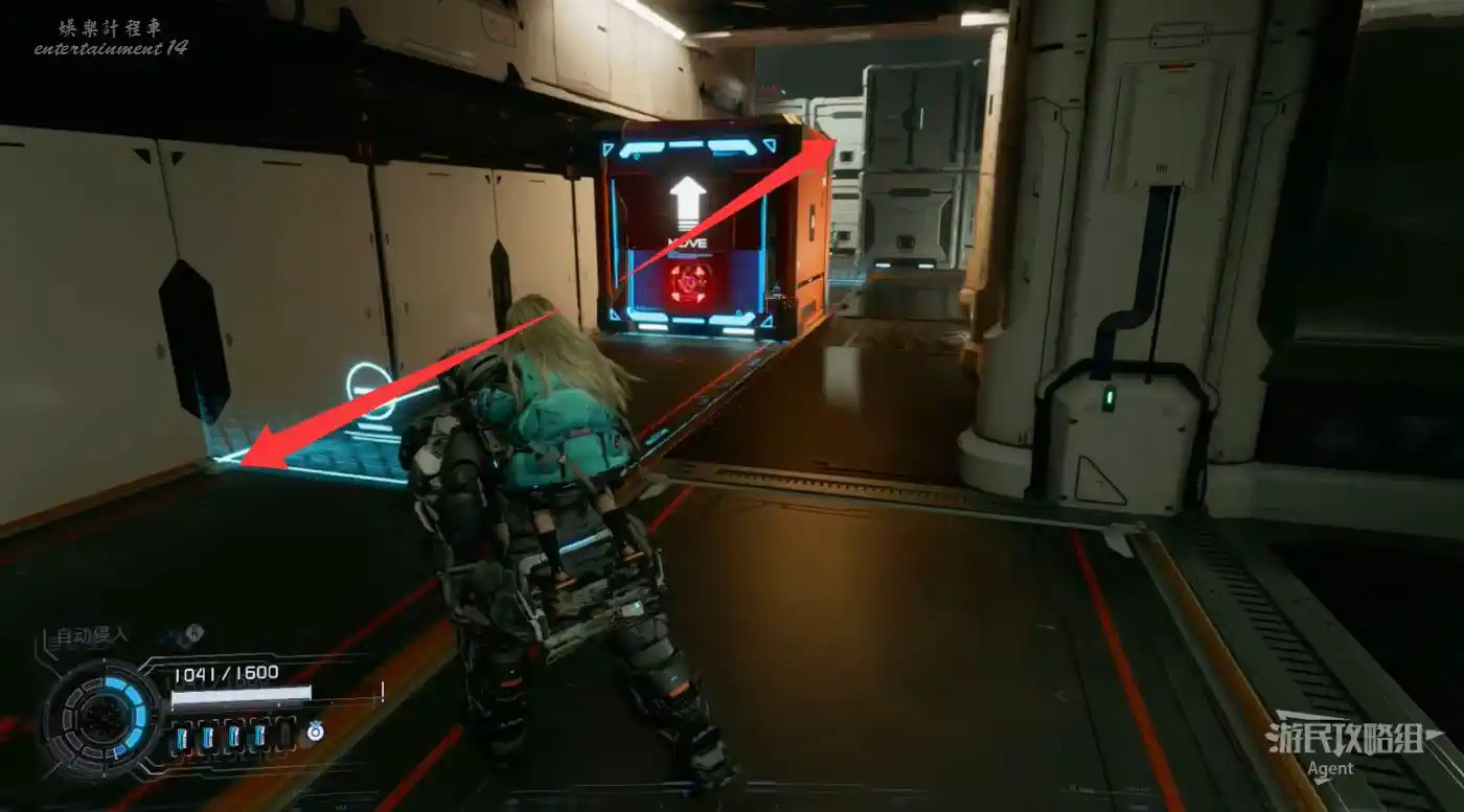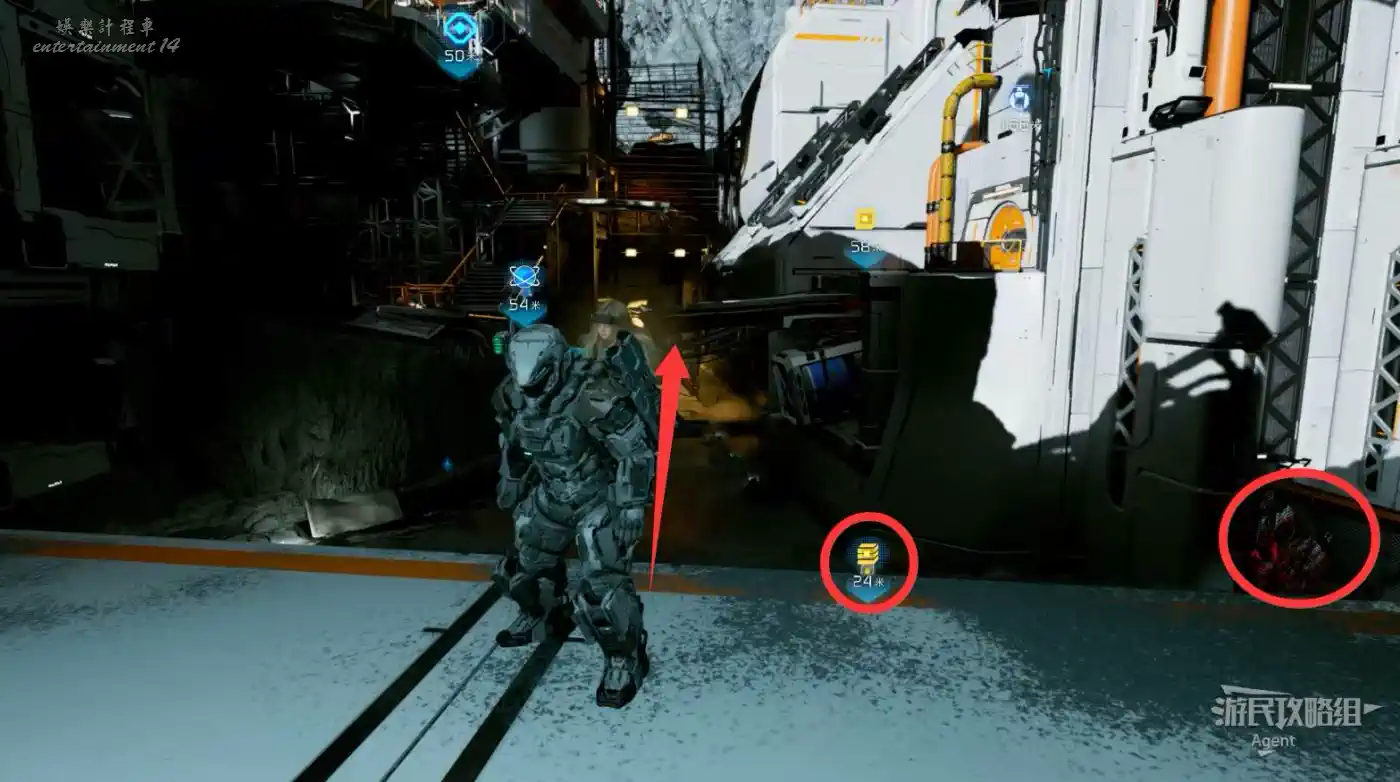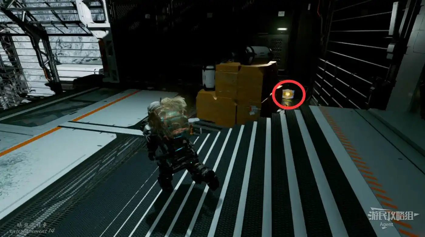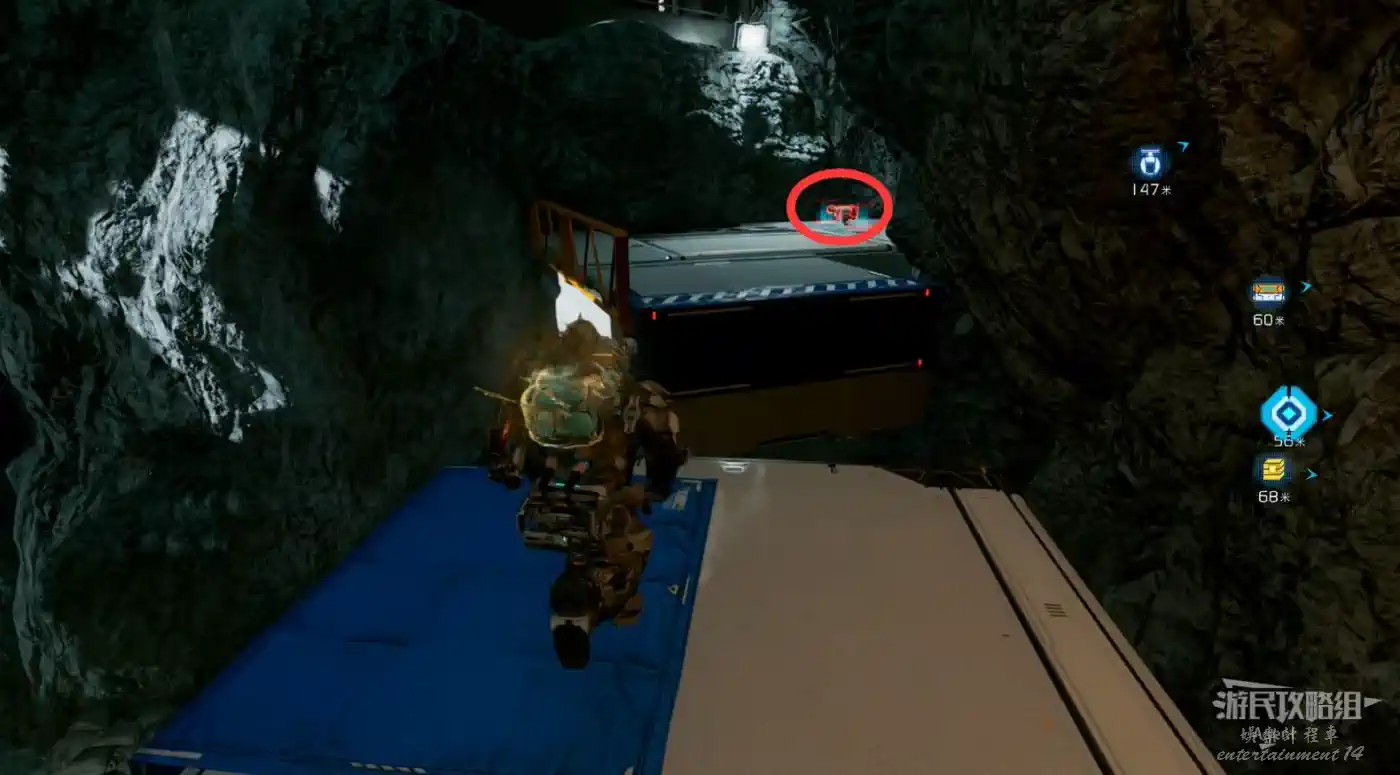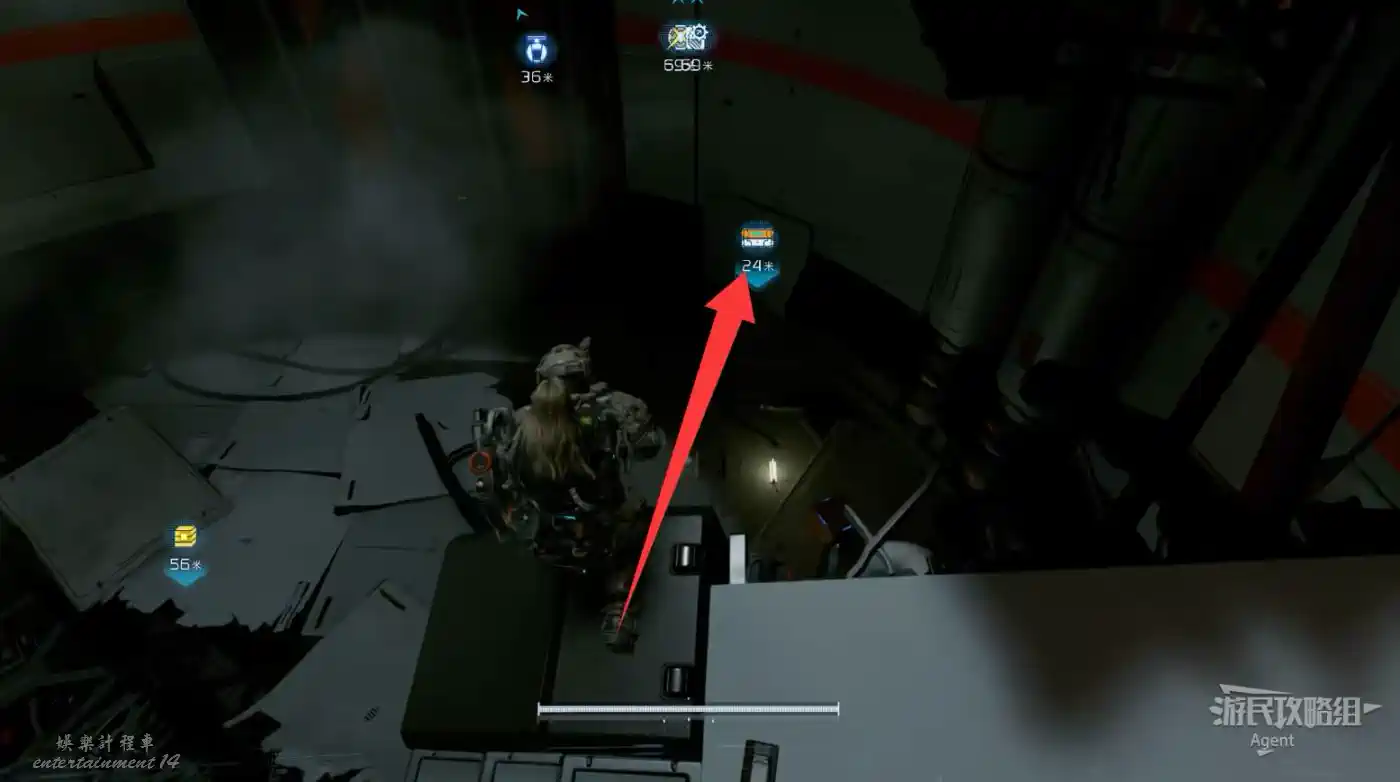 下來消滅敵人後注意,破解牆上紅圈可升級平台,站在平台上,可拿到高處的【升級組件】。然後往前走到頭拿保險箱。