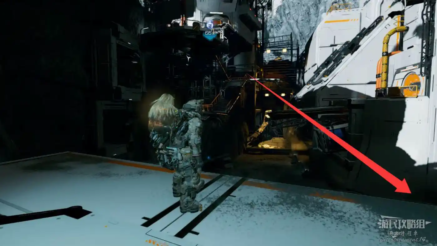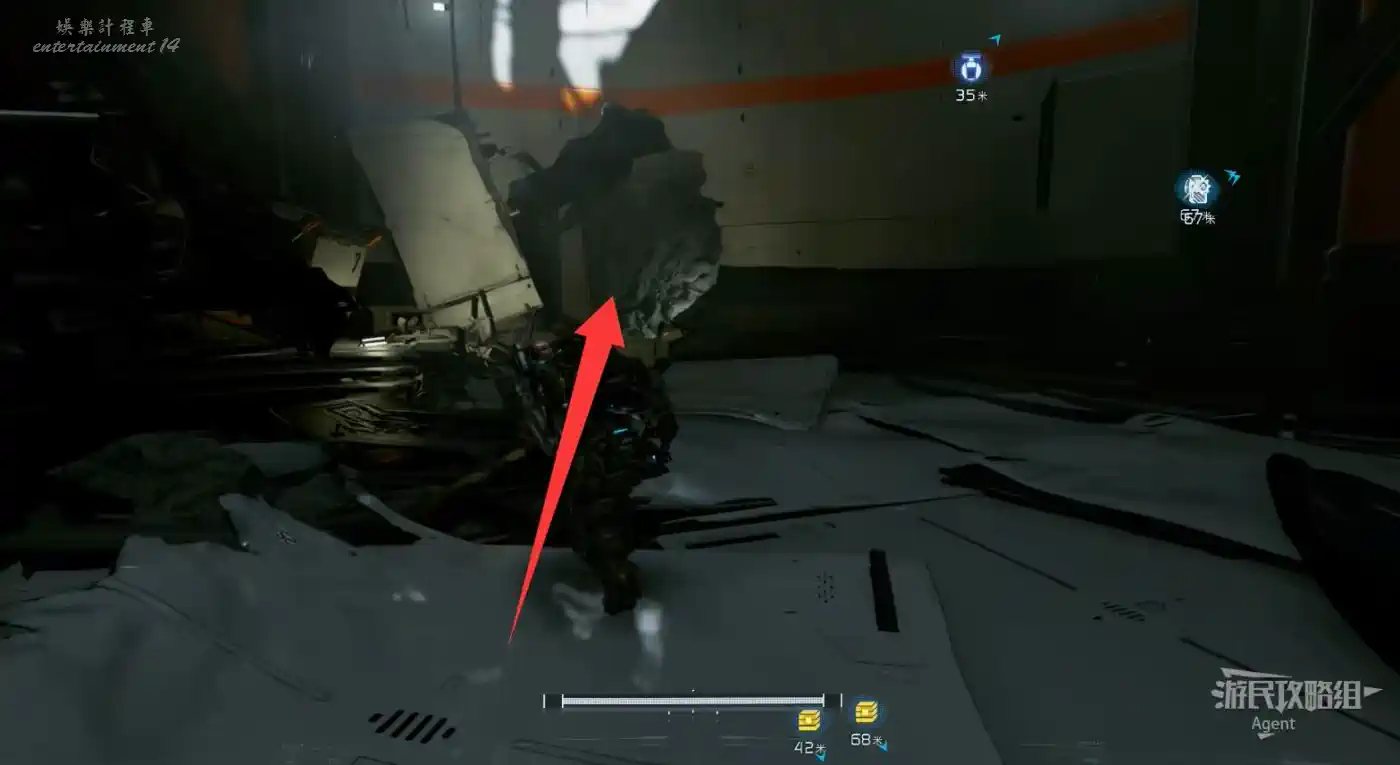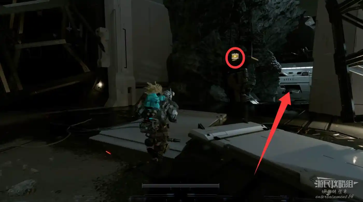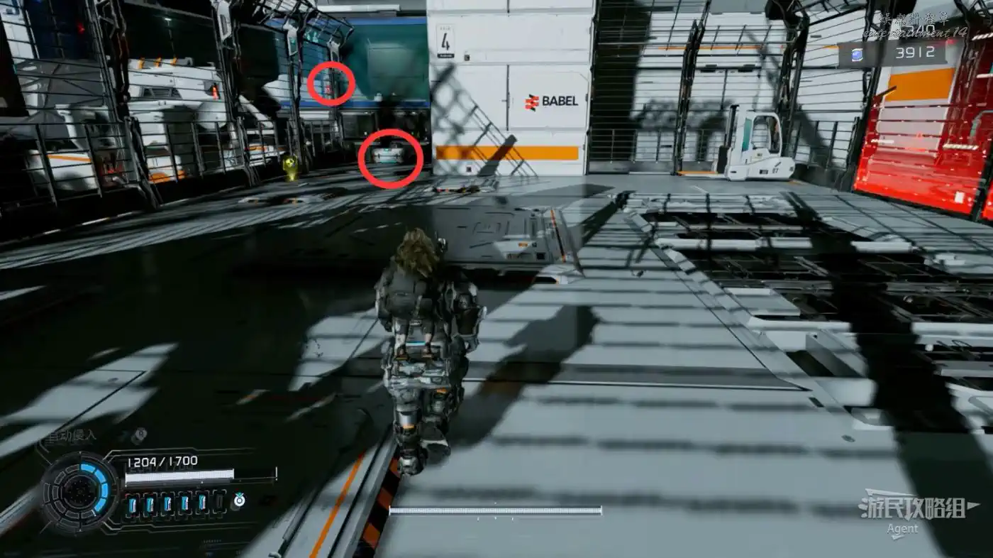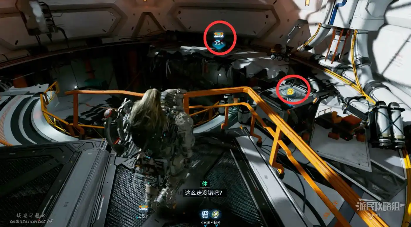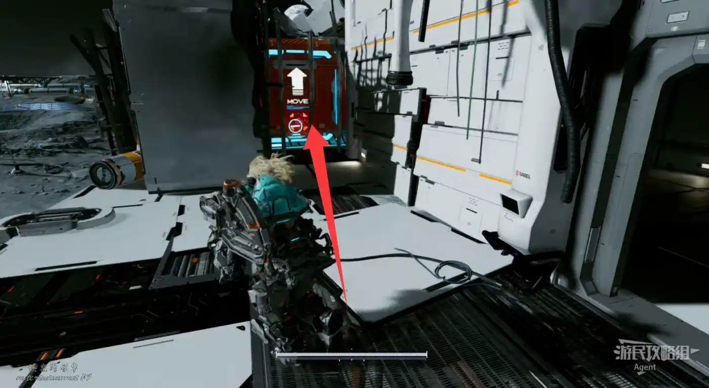 下來消滅敵人後注意,破解牆上紅圈可升級平台,站在平台上,可拿到高處的【升級組件】。然後往前走到頭拿保險箱。