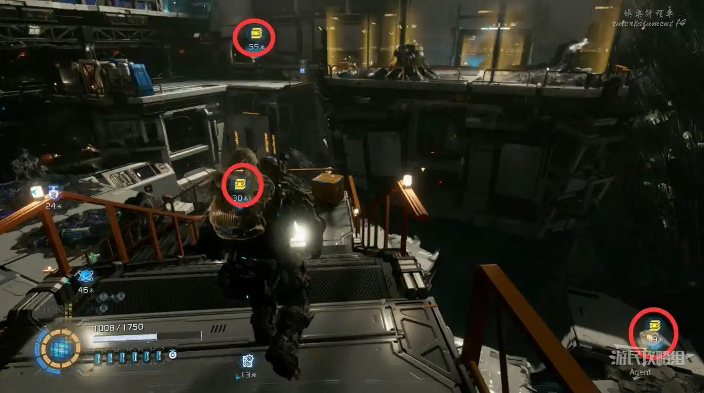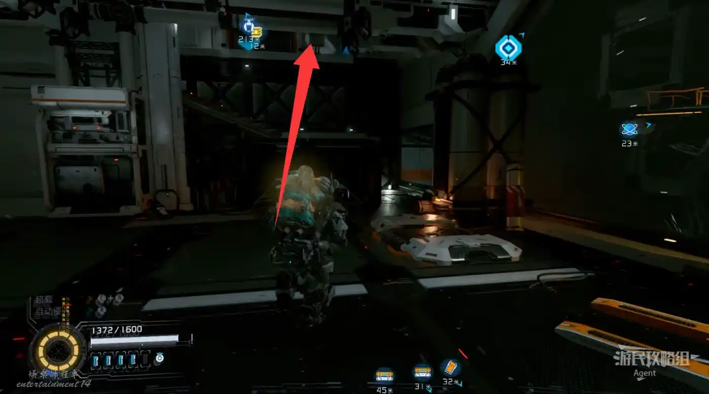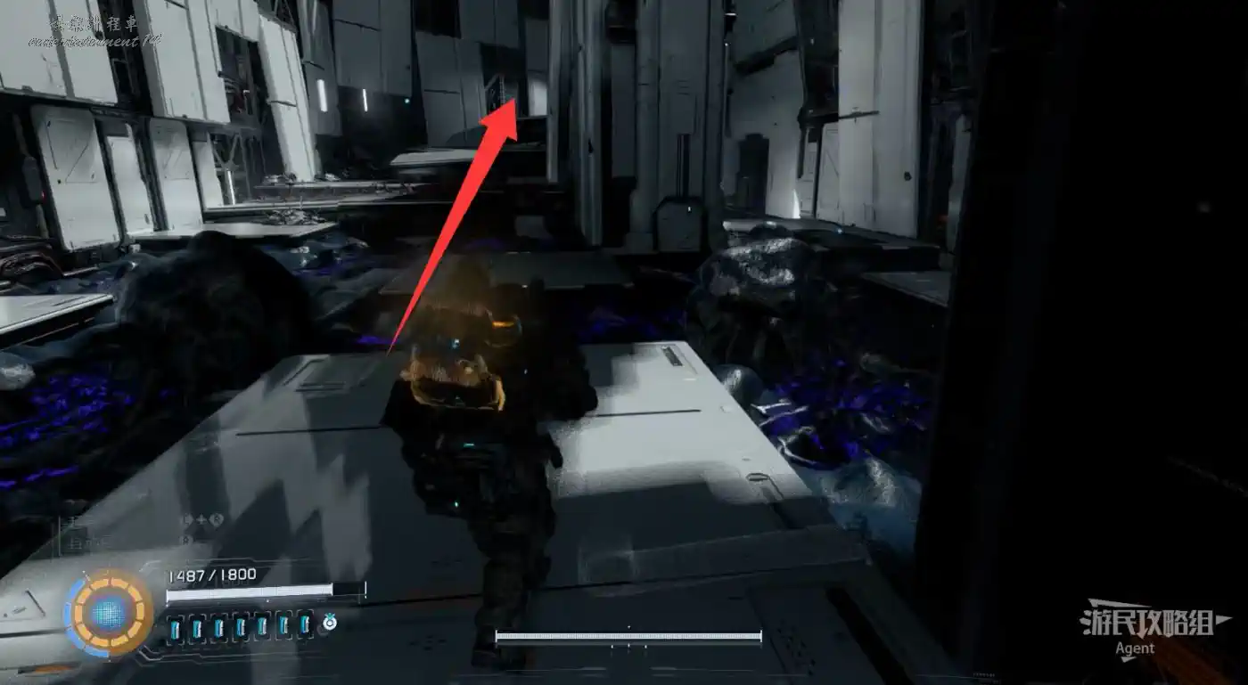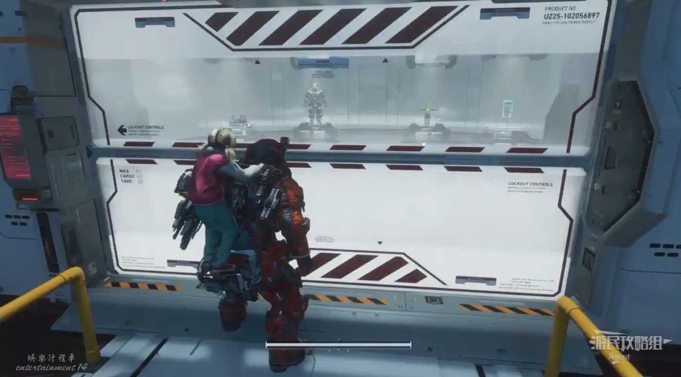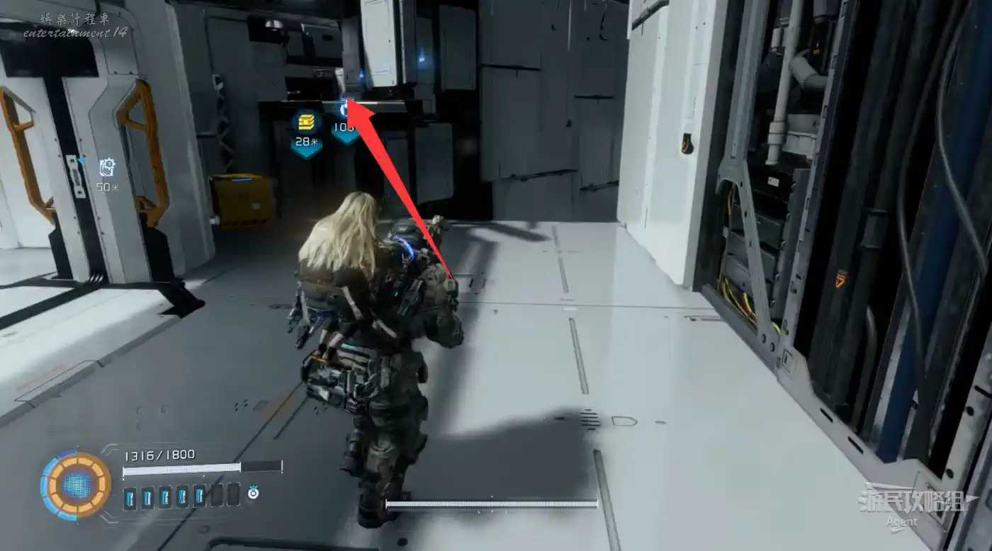 下來消滅敵人後注意,破解牆上紅圈可升級平台,站在平台上,可拿到高處的【升級組件】。然後往前走到頭拿保險箱。