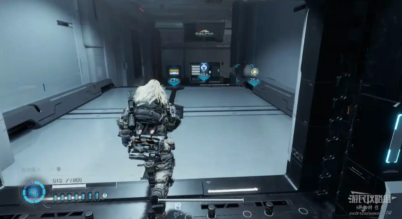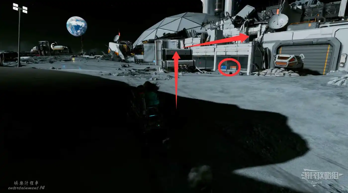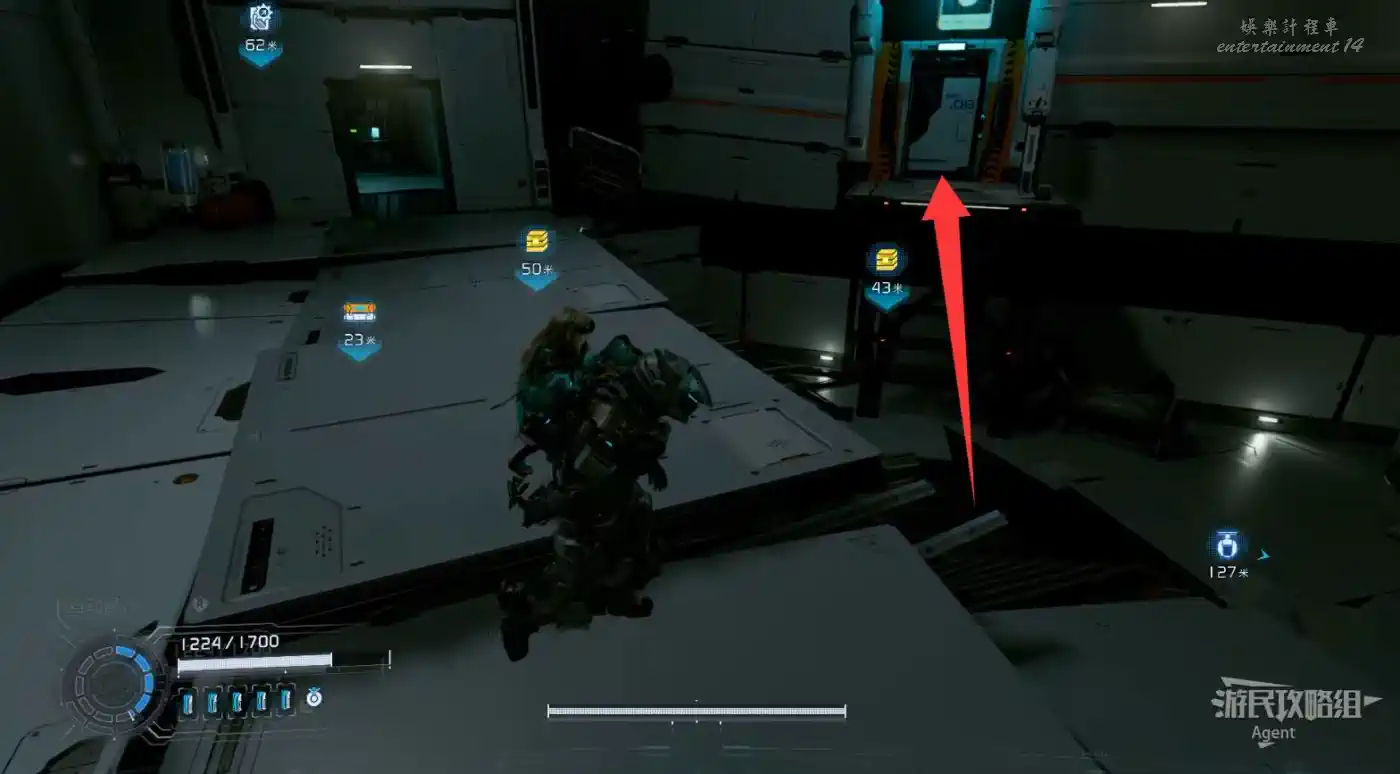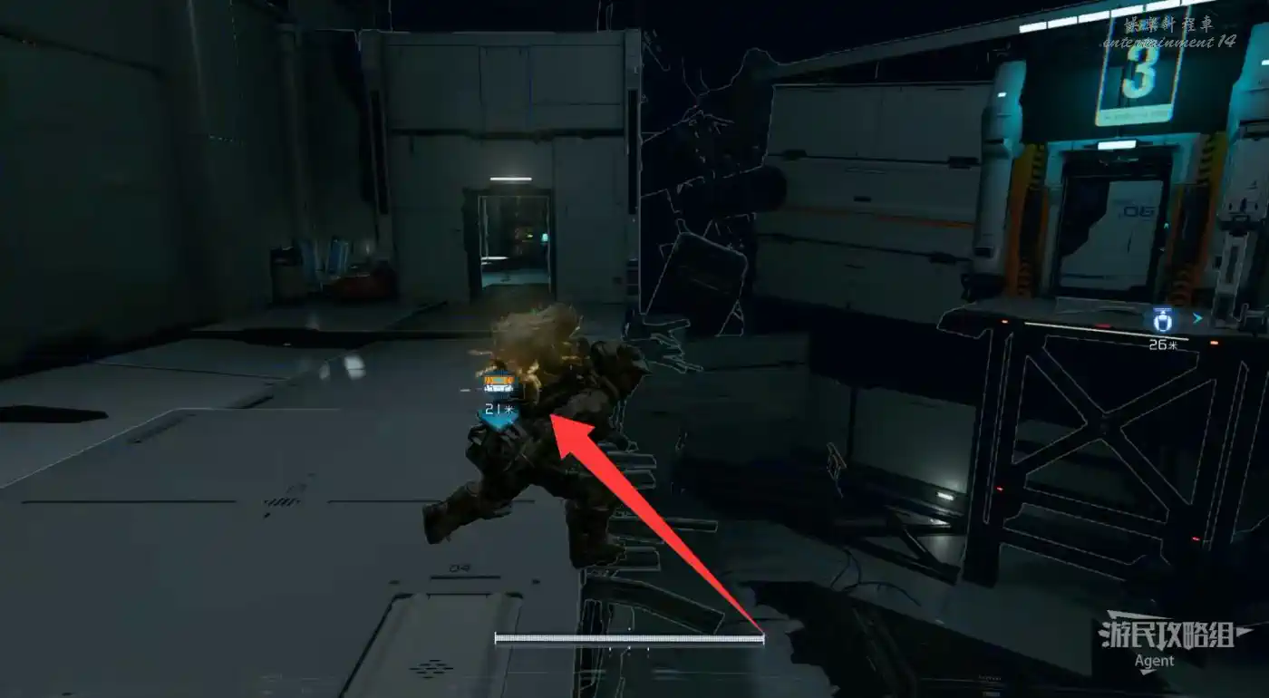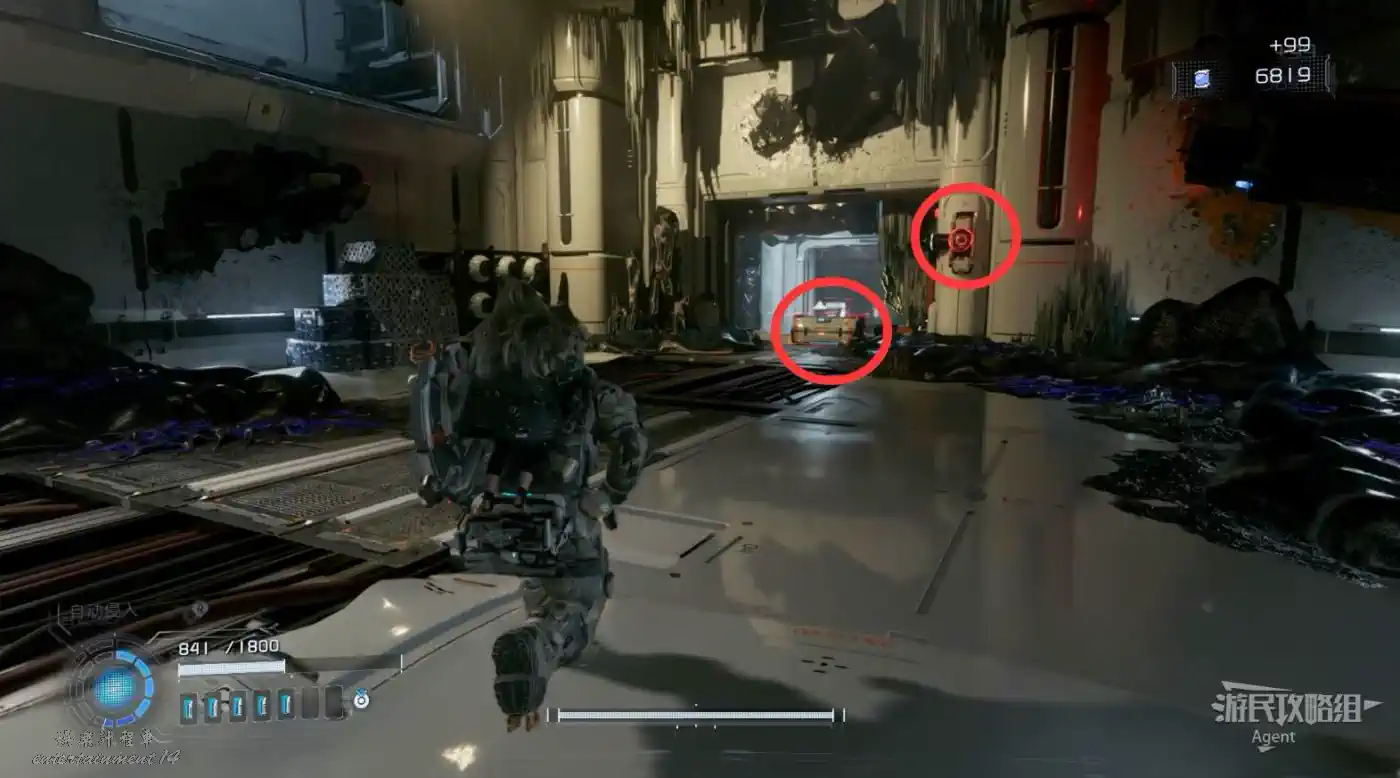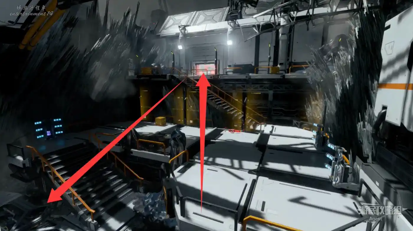下來消滅敵人後注意,破解牆上紅圈可升級平台,站在平台上,可拿到高處的【升級組件】。然後往前走到頭拿保險箱。
