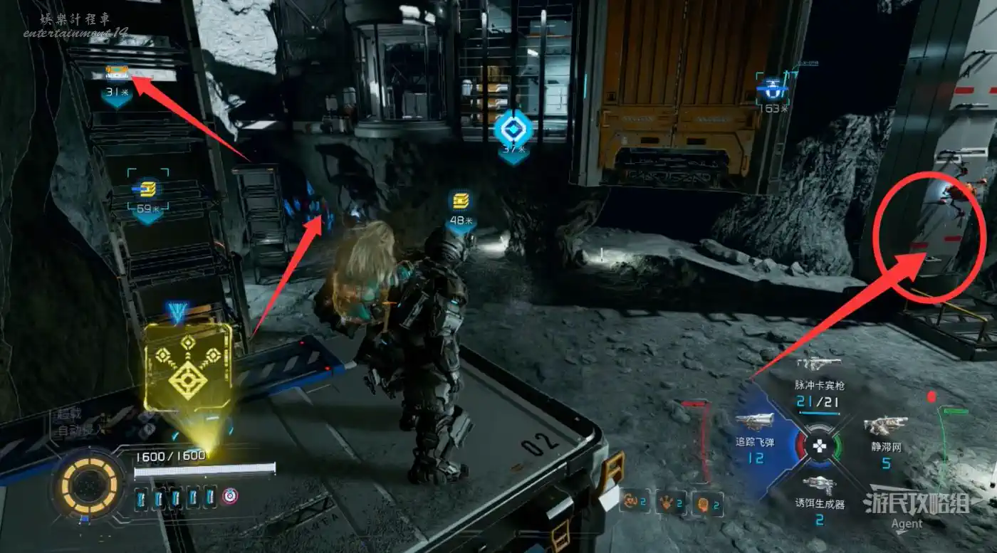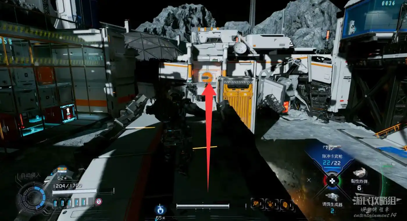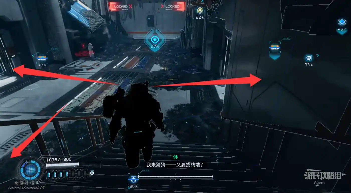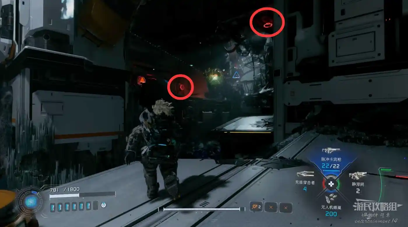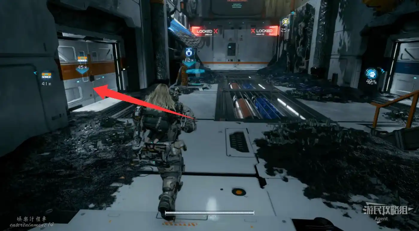 幹掉飛行器後,看到門上有兩個鎖,需要在附近找到兩個紅圈破解。