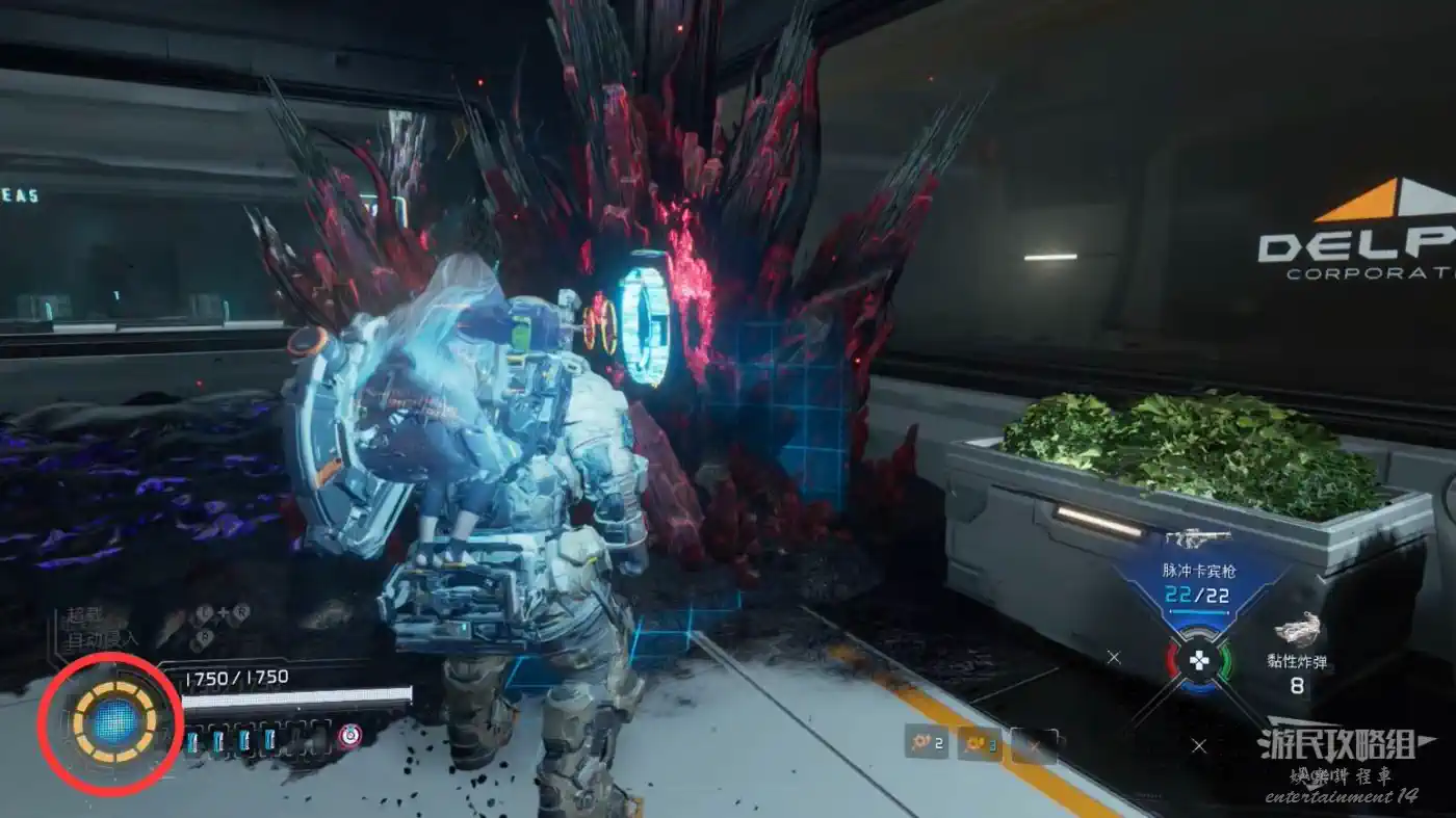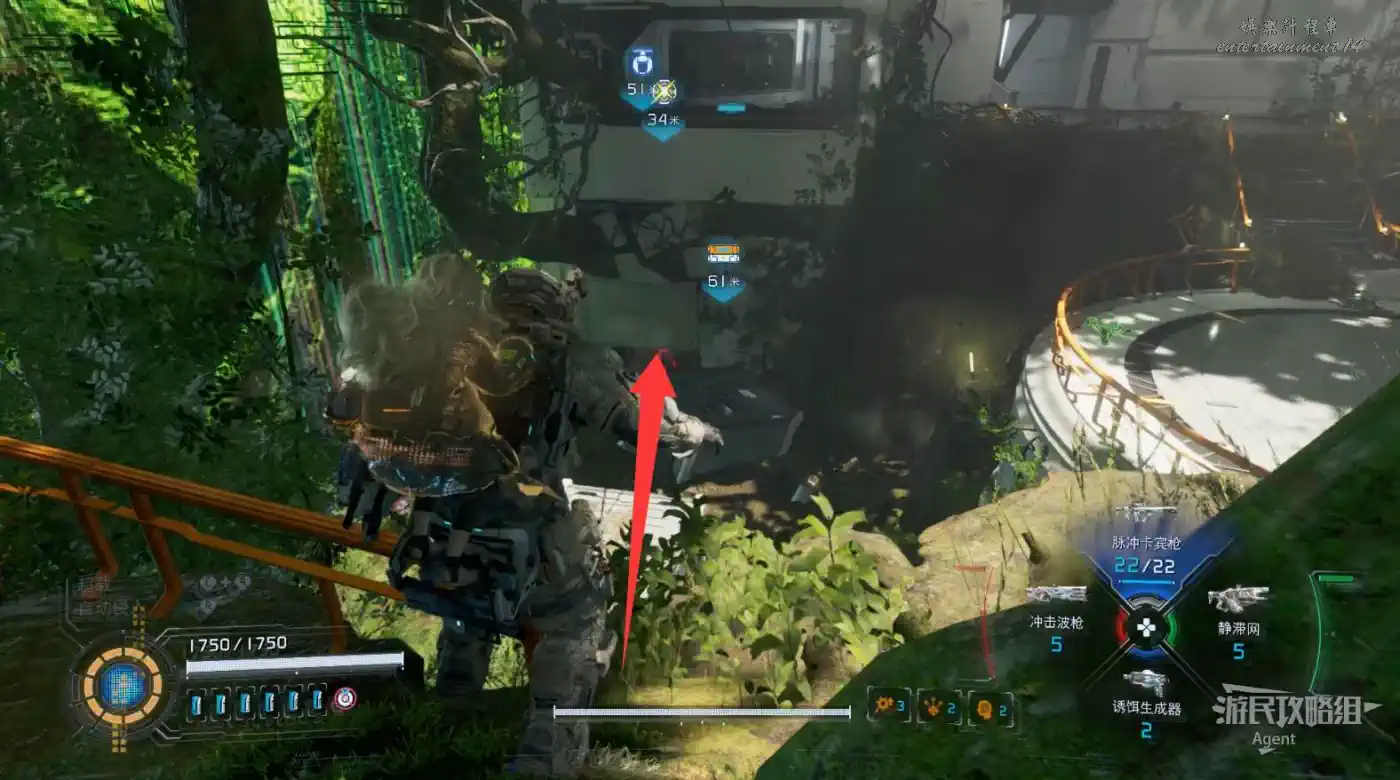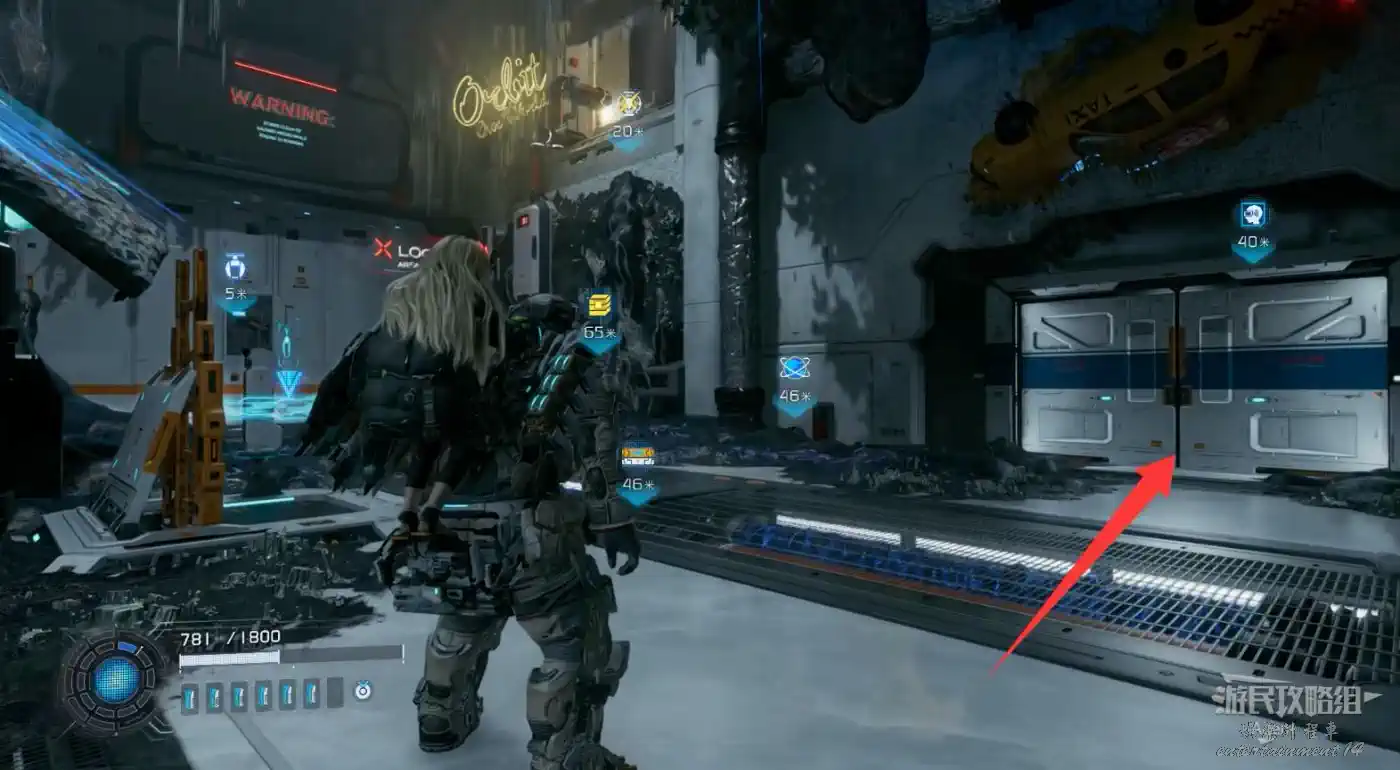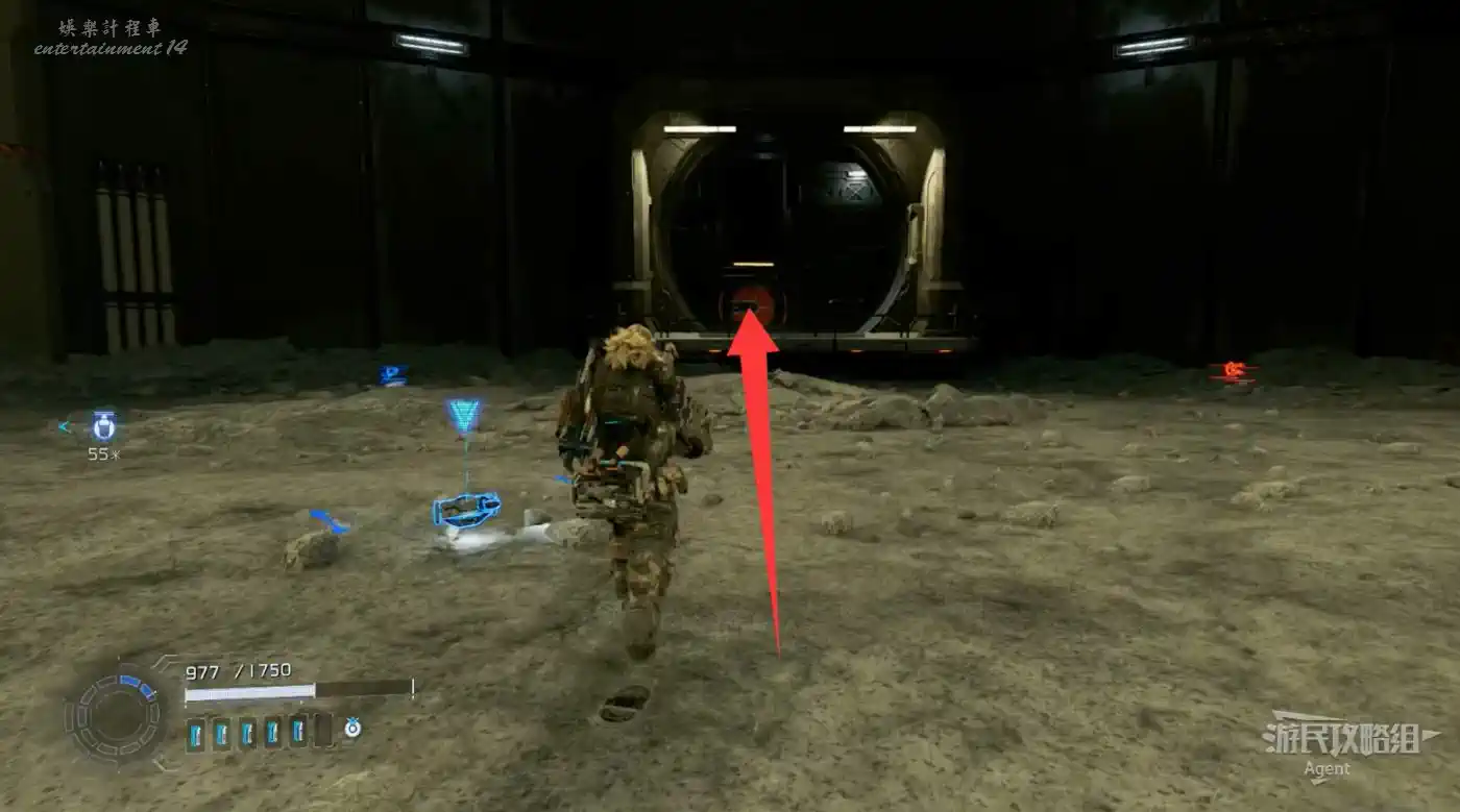 幹掉飛行器後,看到門上有兩個鎖,需要在附近找到兩個紅圈破解。